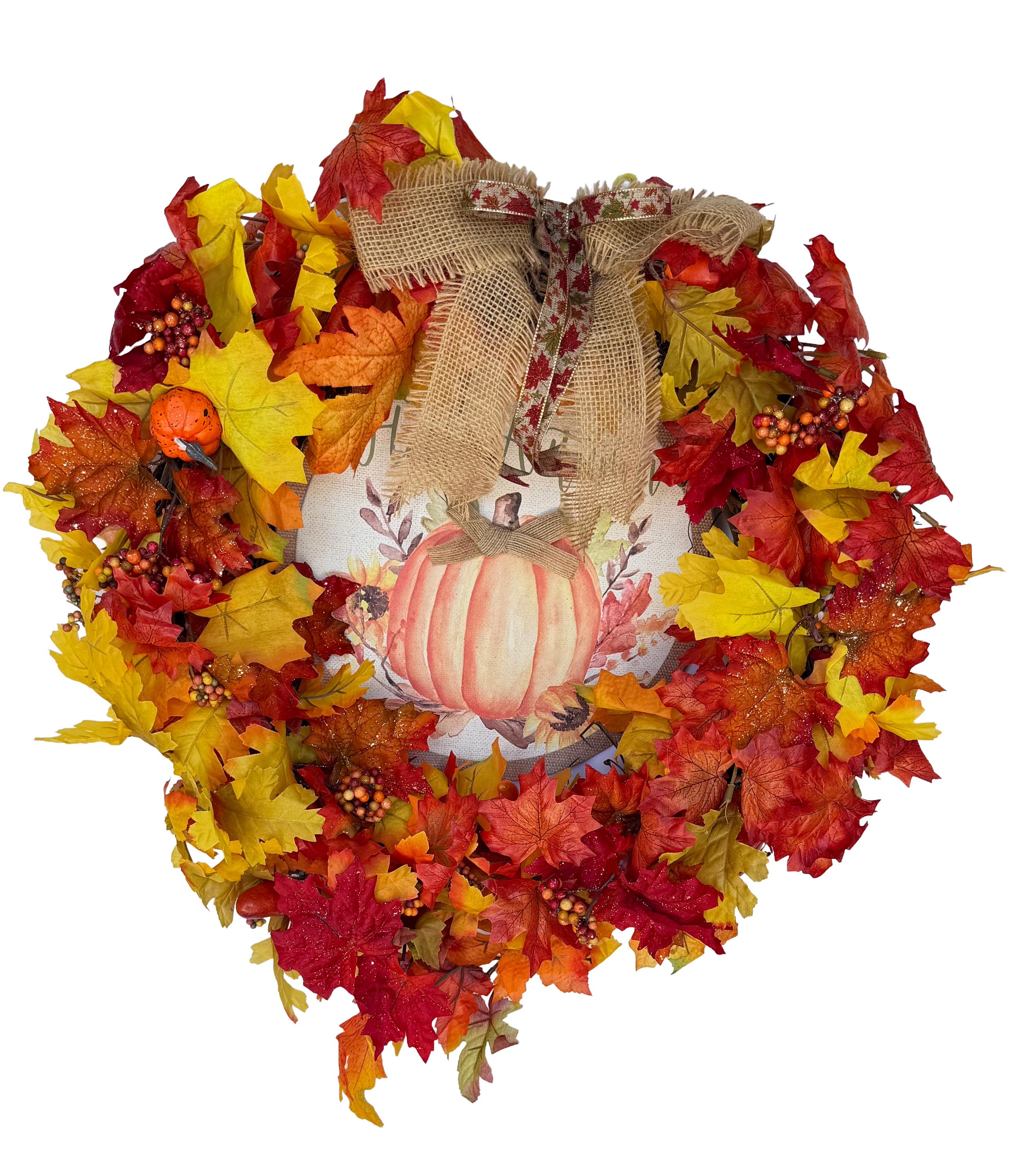 Autumn color leaves, Small Pumpkins and Berries add Elegance to the wreath and perfect to decorate your home's front door, for the Fall season, or great as a Gift.