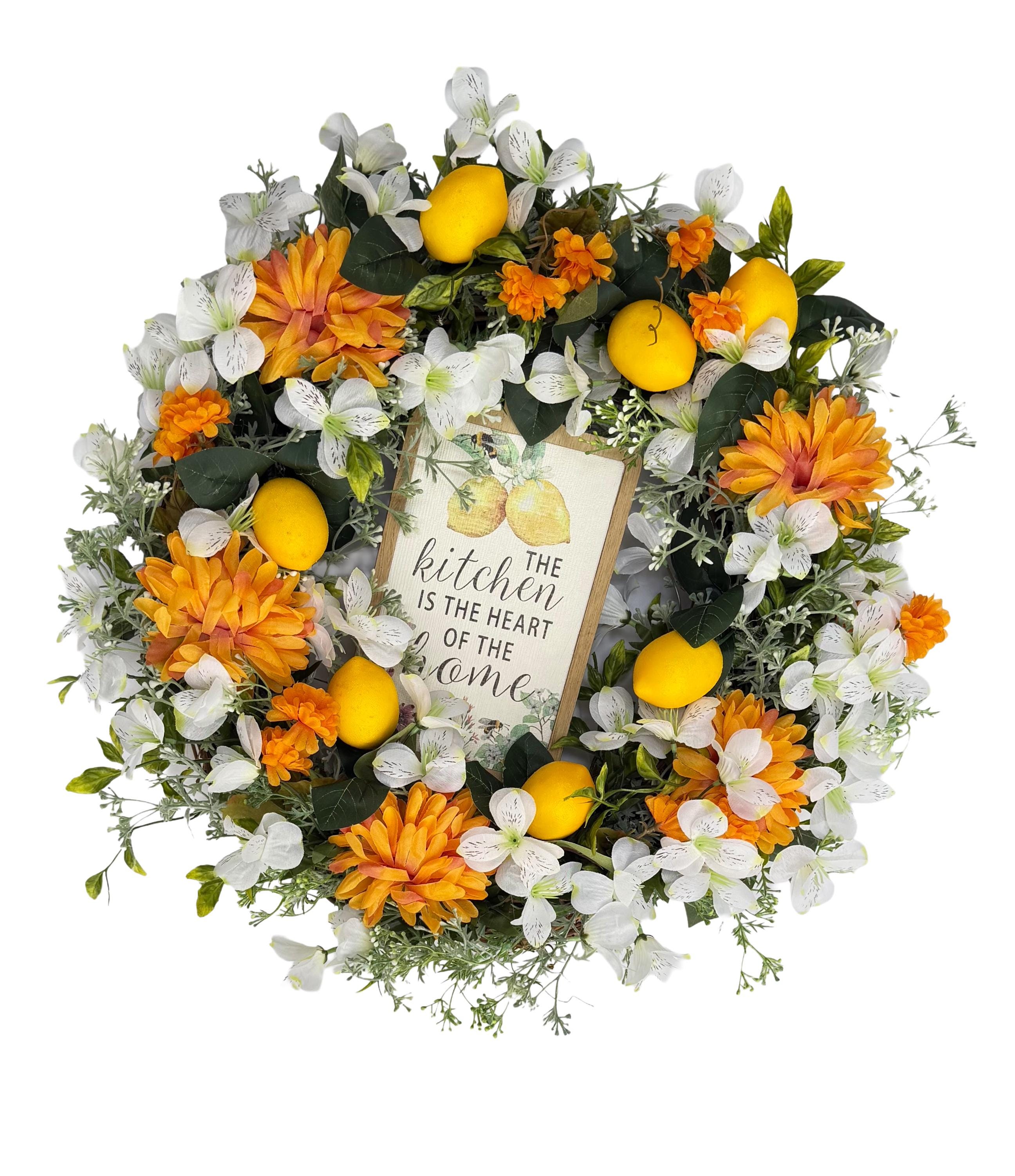 Bright color Lemon wreath gives your home entrance or kitchen area with fresh feeling as it decorated with beautiful Yellow fake Lemon, White and Orange flowers with Green Leaves. Wooden Framed Sign add Elegance to the wreath with wordings of “ THE KITCHEN IS THE HEART OF THE HOME” and is perfect to decorate your home's front door and Kitchen through out the year, also great as a Gift.