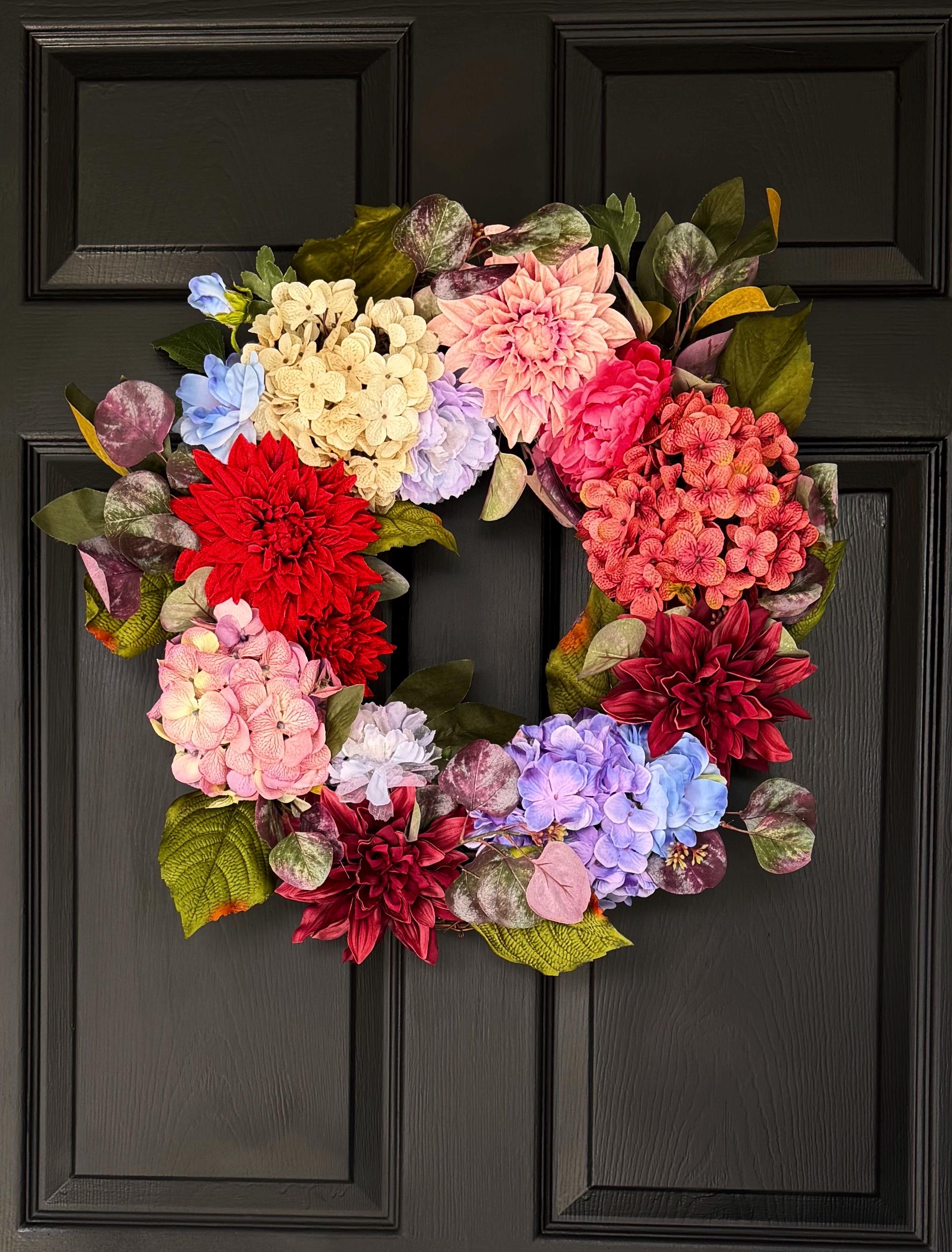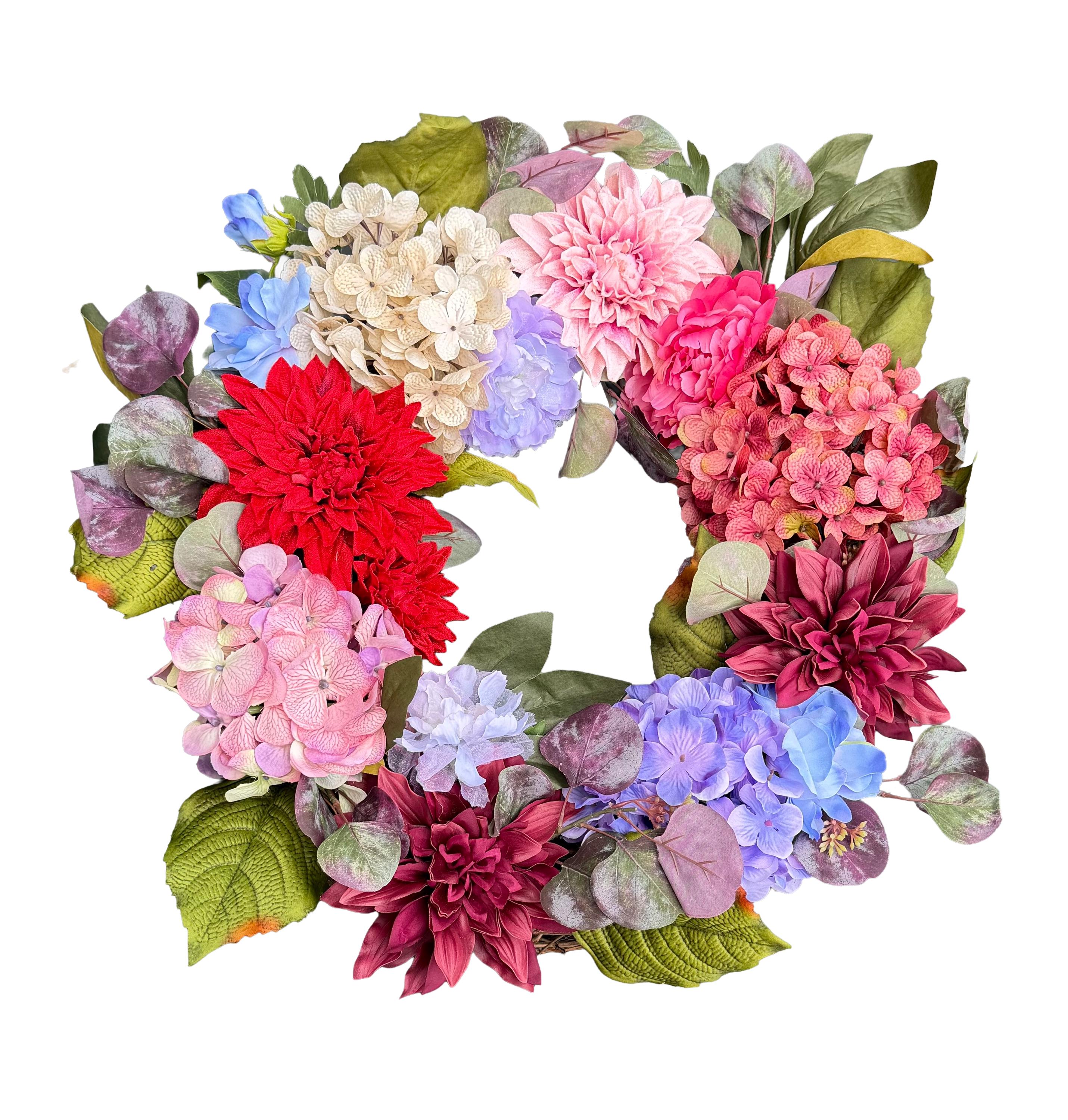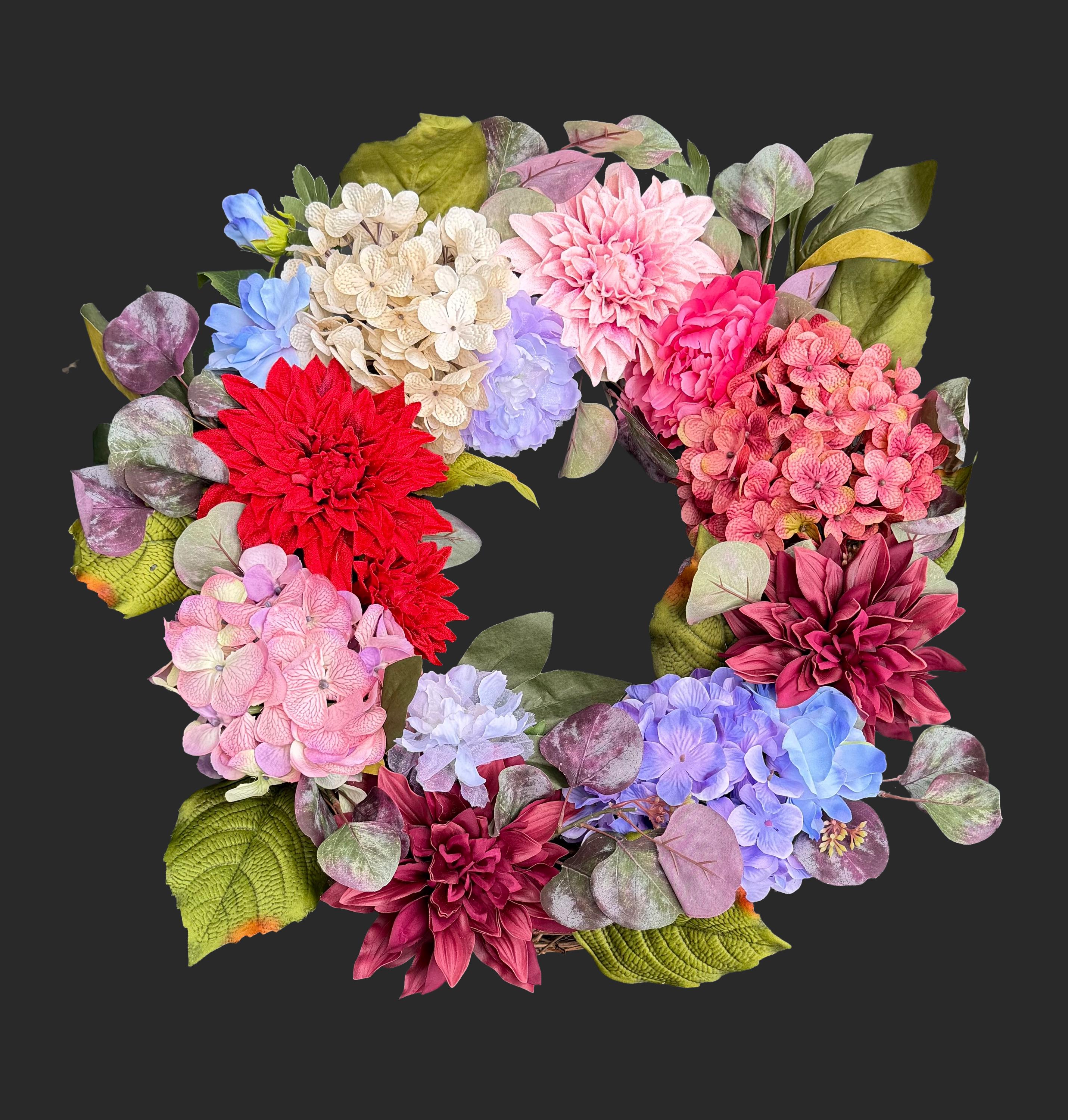 The wreath decorated with beautiful Red, Pink, White and Purple Hydrangeas with Dhalia flowers with added leaves gives a Spring and Sumer feelings.