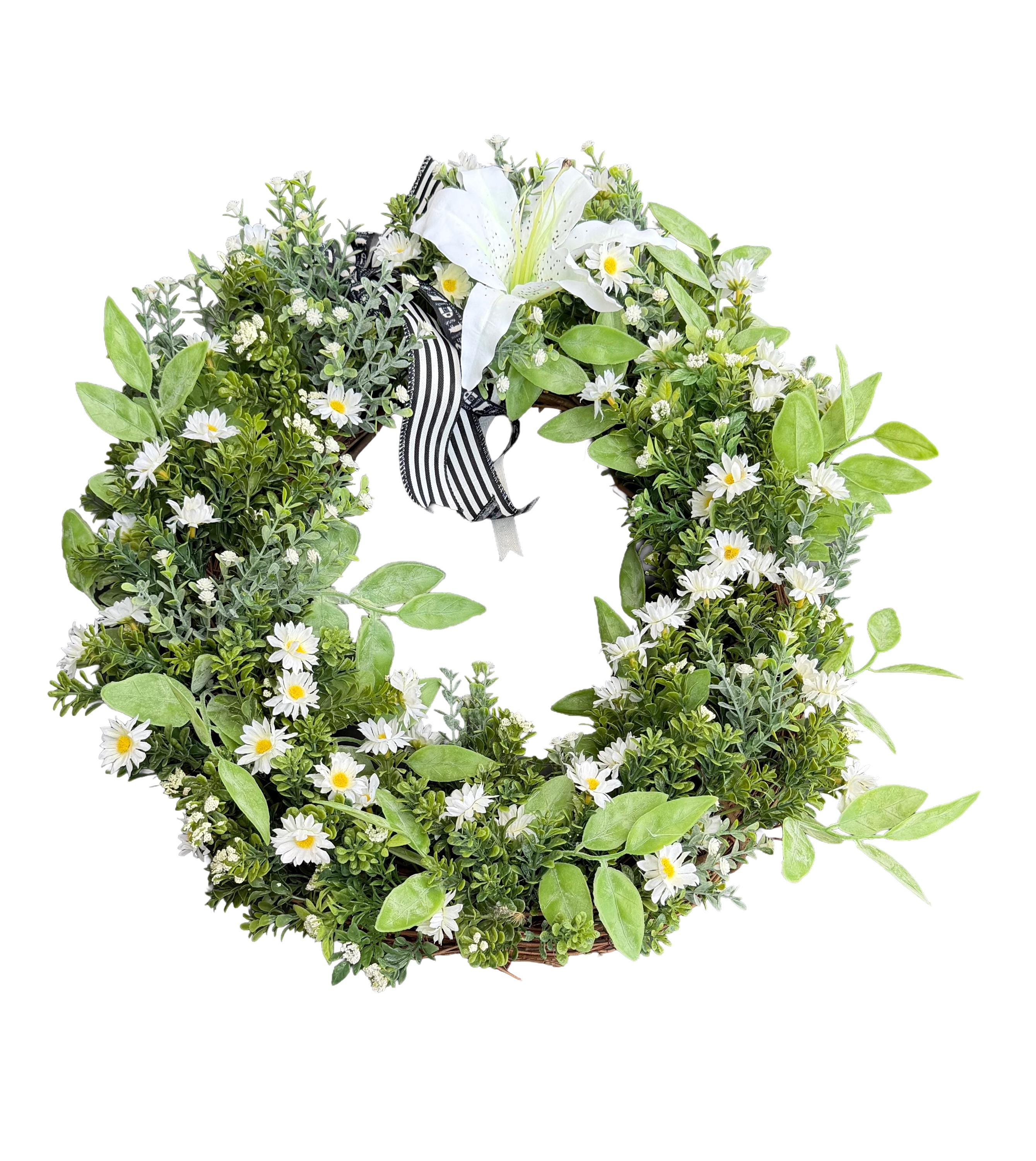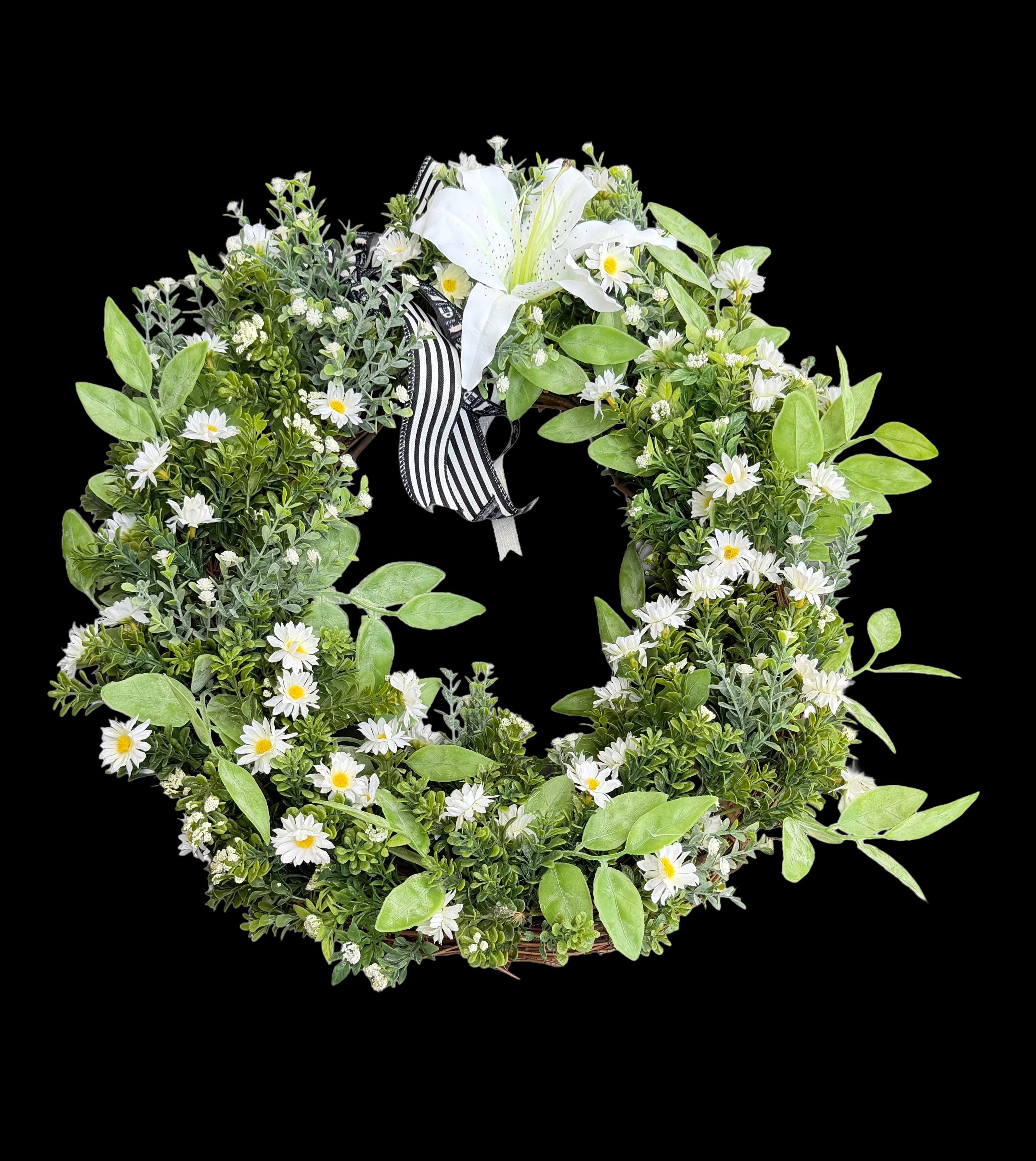 The wreath decorated with Green shaded leaves with white Tiger Lily with Black and White Bow gives a Year Around feelings.