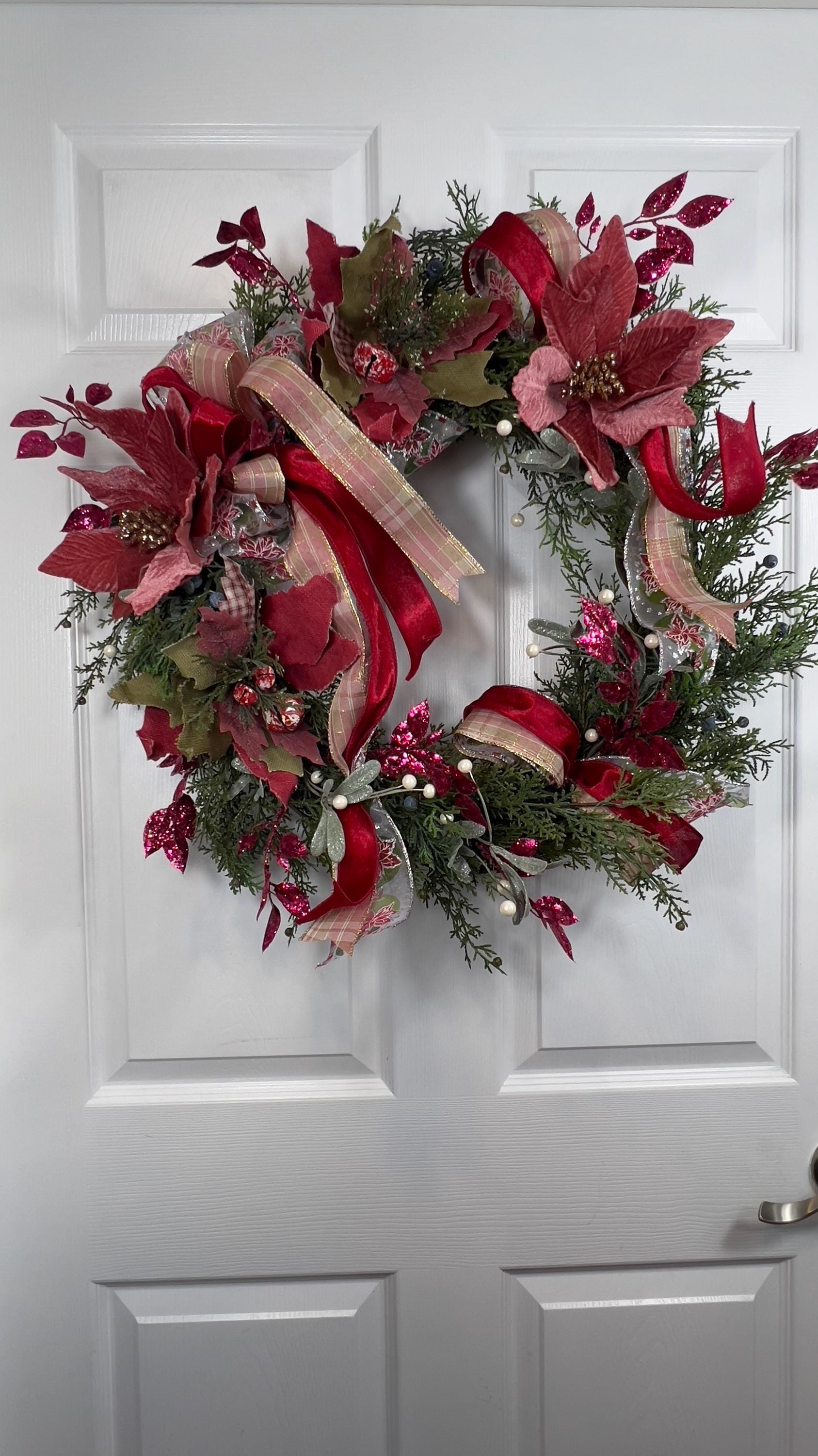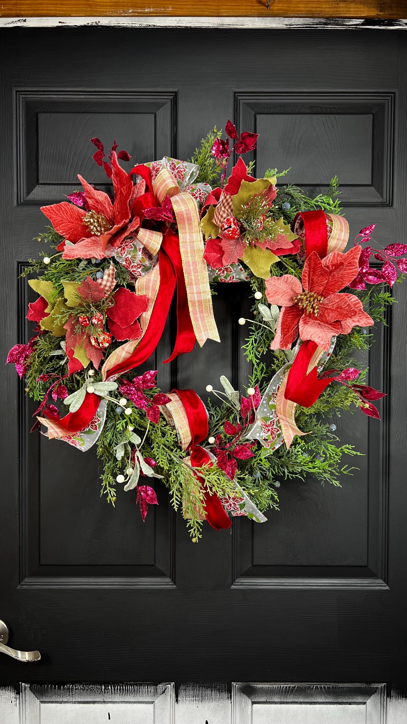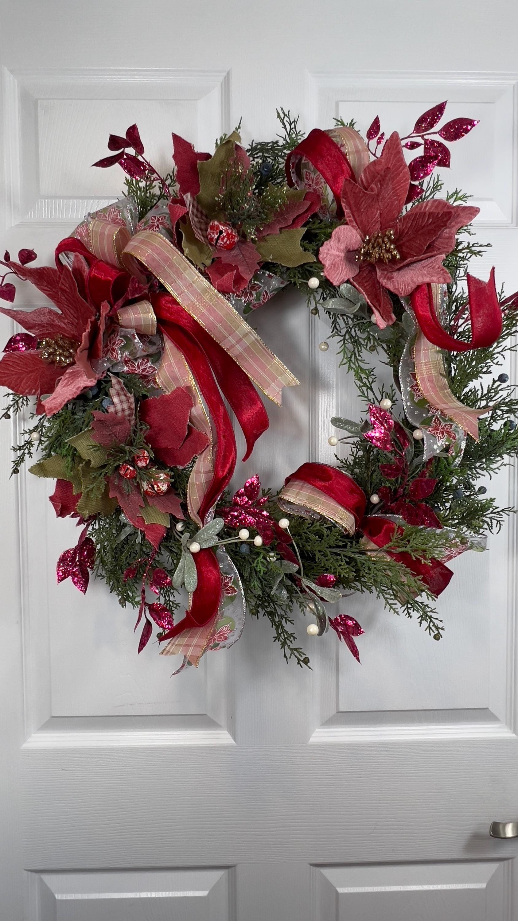 This Wreath created to decorate your entrance with Holiday spirit!! Shade of pink Poinsettias, berries, glitterey leaves and ferns, with beautiful bow highlight the Christmas season.