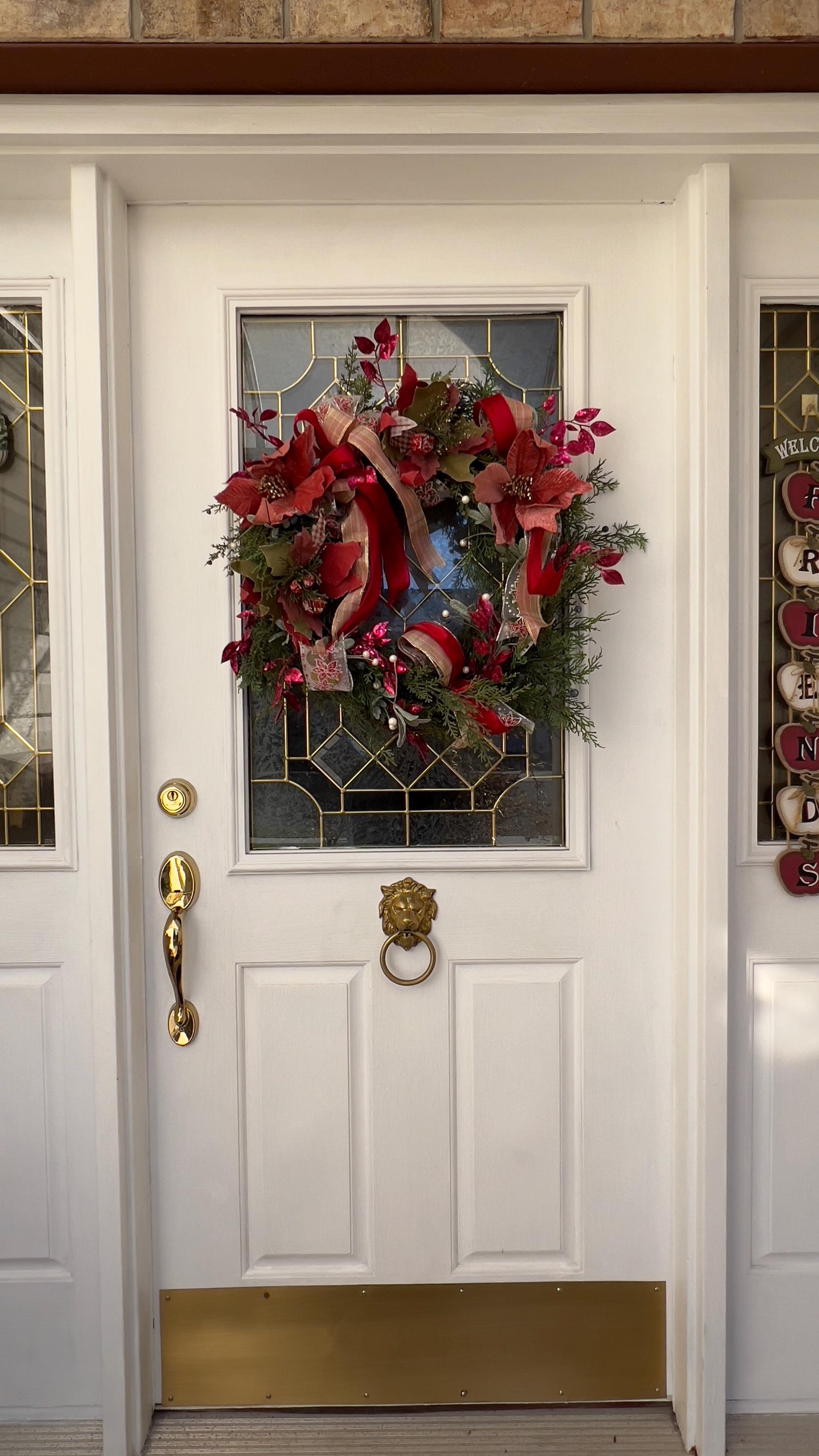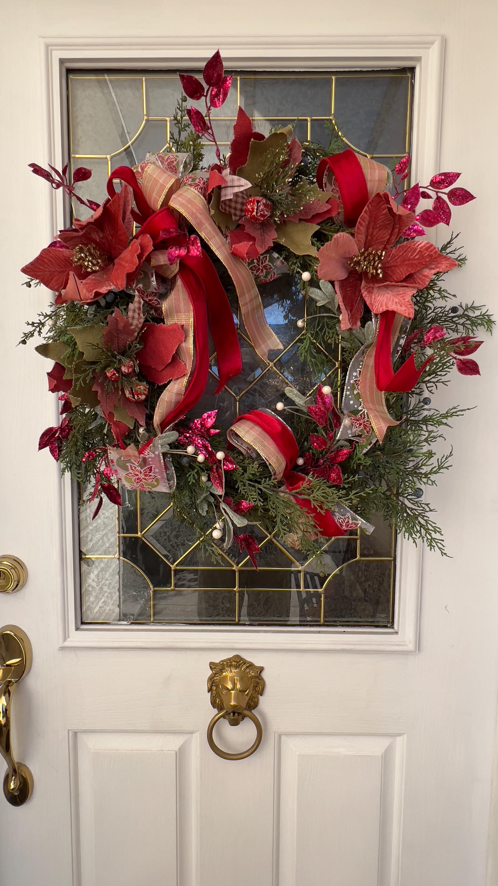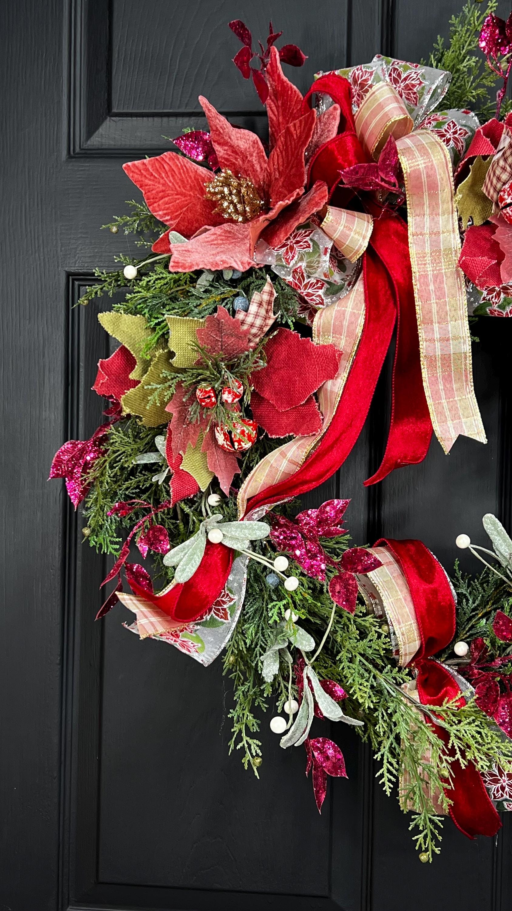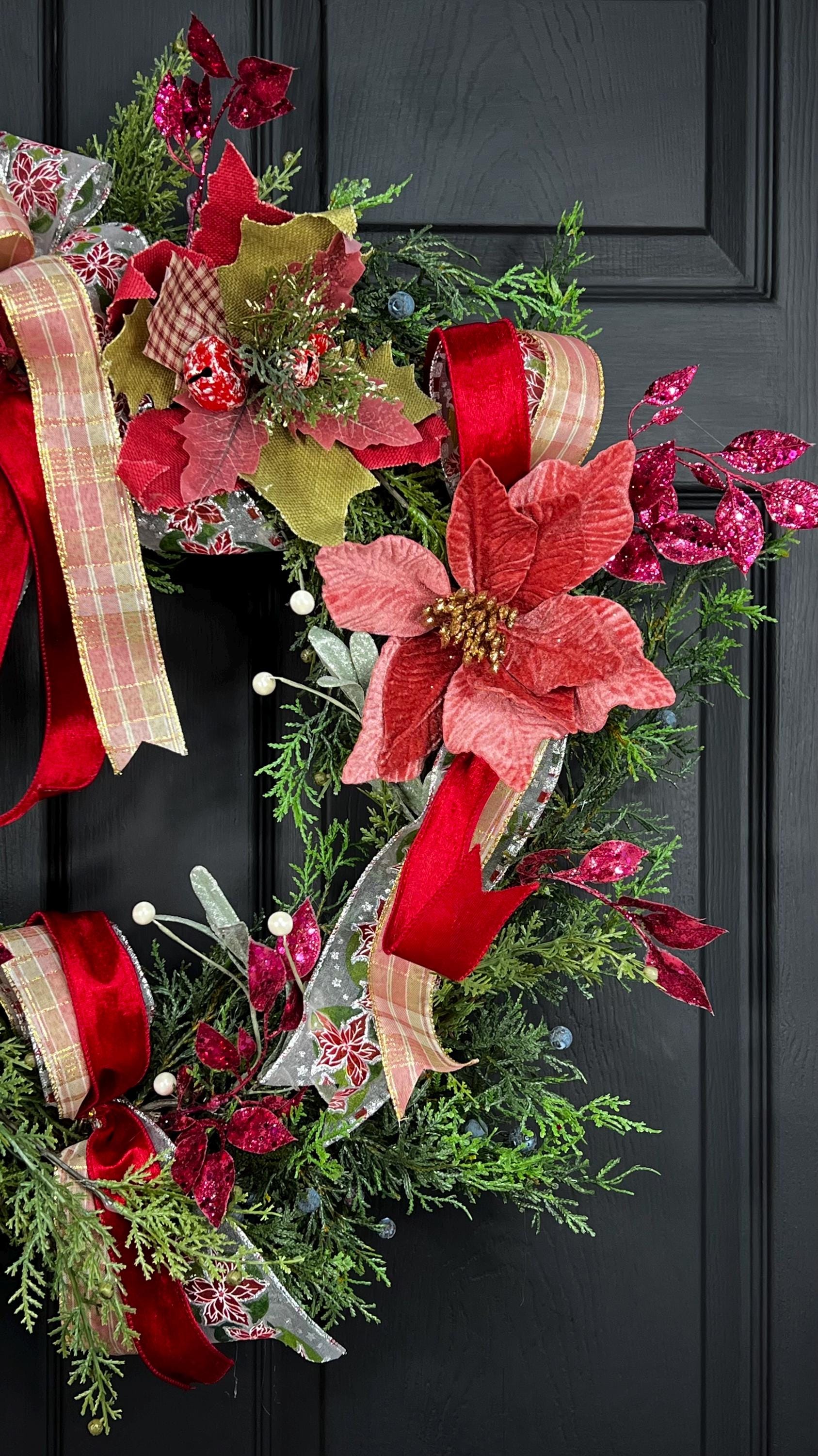 This Wreath created to decorate your entrance with Holiday spirit!! Shade of pink Poinsettias, berries, glitterey leaves and ferns, with beautiful bow highlight the Christmas season.