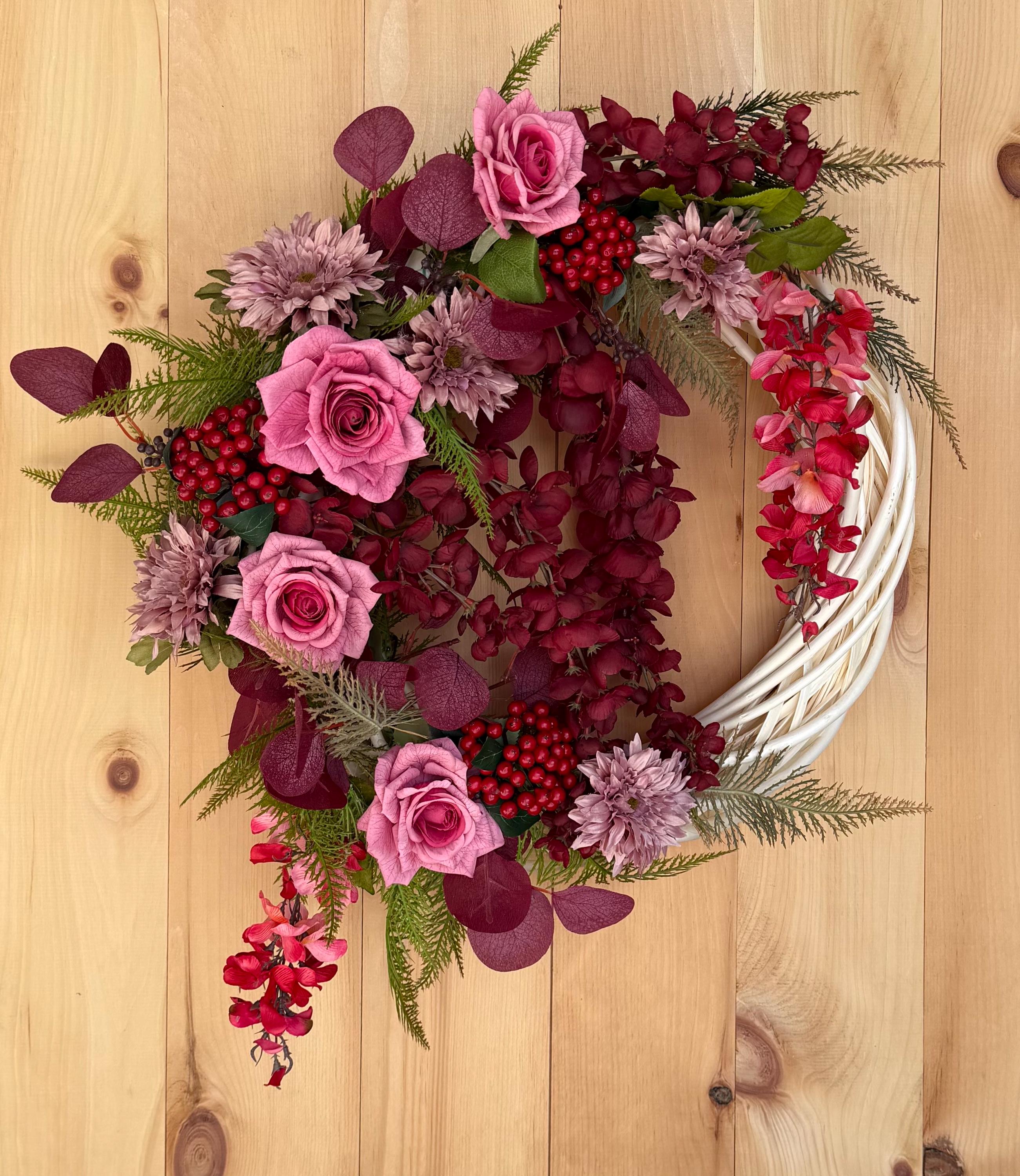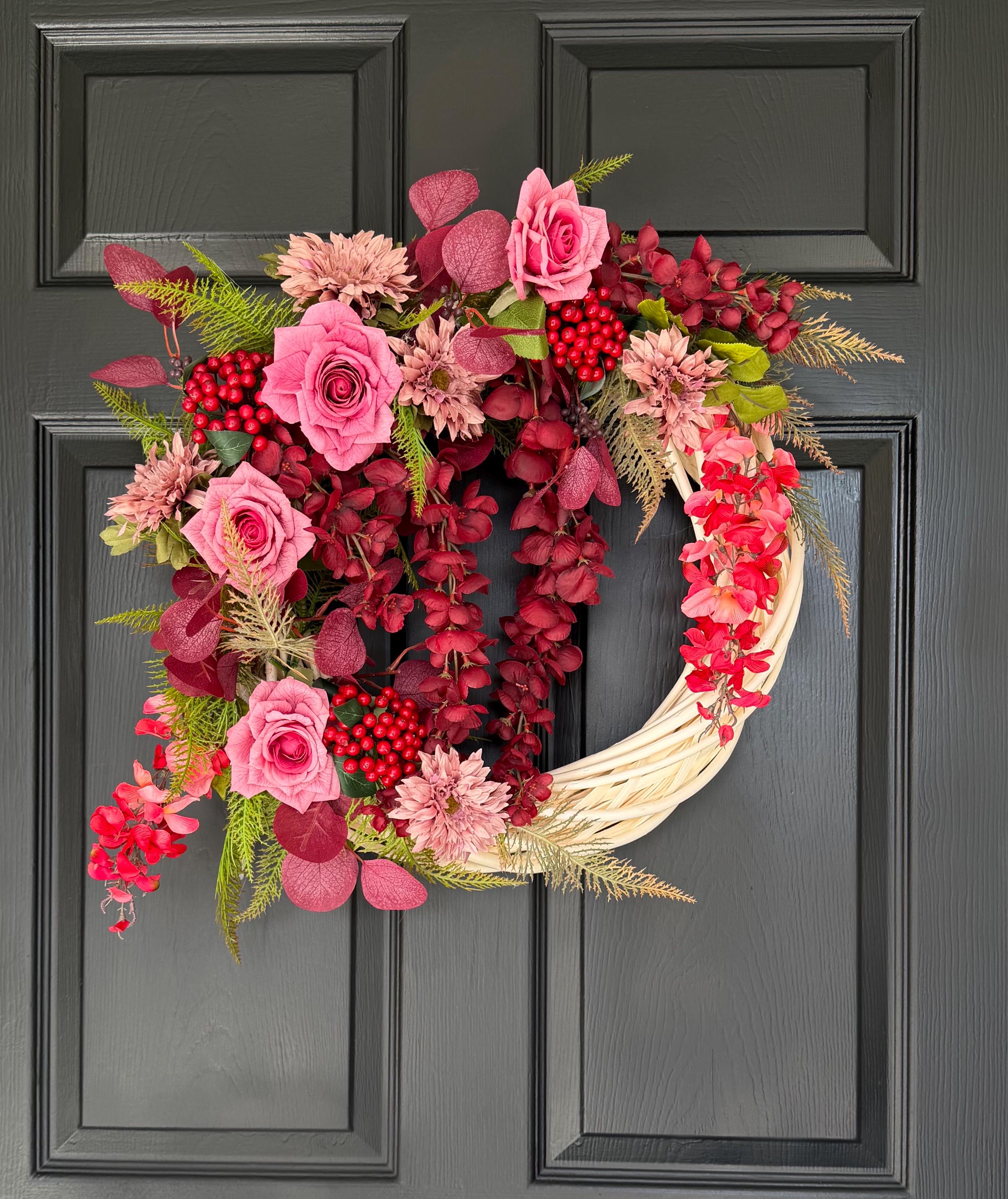 This Elegant wreath is decorated with beautiful Red Roses, Hydrangea, Ranunculus and other various flowers with pink and green leaves. Added hanging Wisteria Vines in Pink and Red enhances the elegance of the wreath. All the flowers and colors give your entrance a welcoming Spring and Sumer feeling.