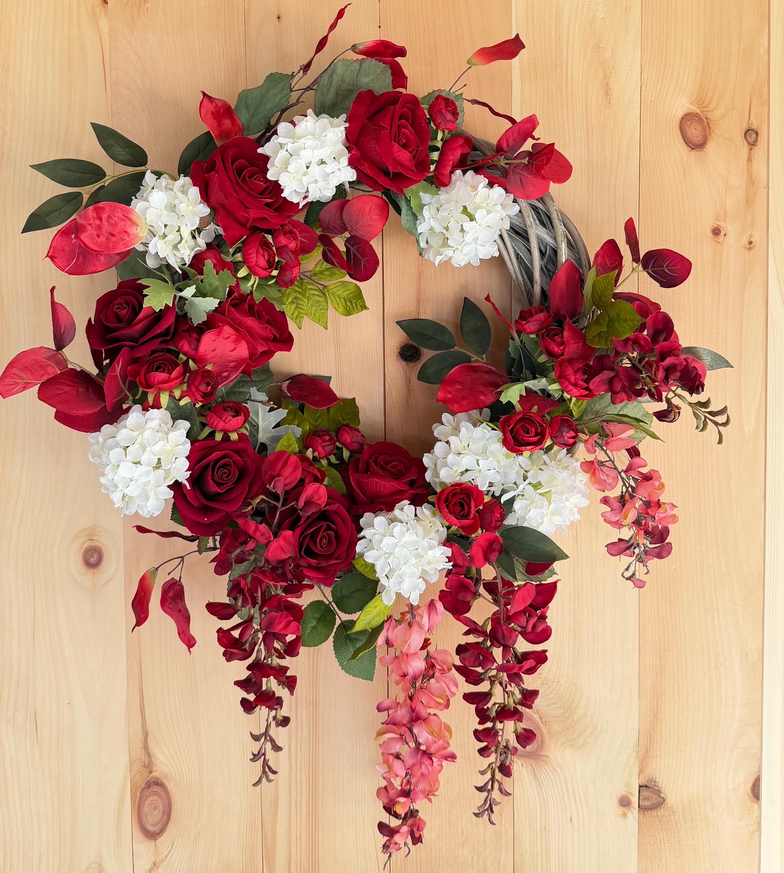 This Elegant wreath is decorated with beautiful Red Roses, Hydrangea, Ranunculus and other various flowers with pink and green leaves. Added hanging Wisteria Vines in Pink and Red enhances the elegance of the wreath. All the flowers and colors give your entrance a welcoming Spring and Sumer feeling.