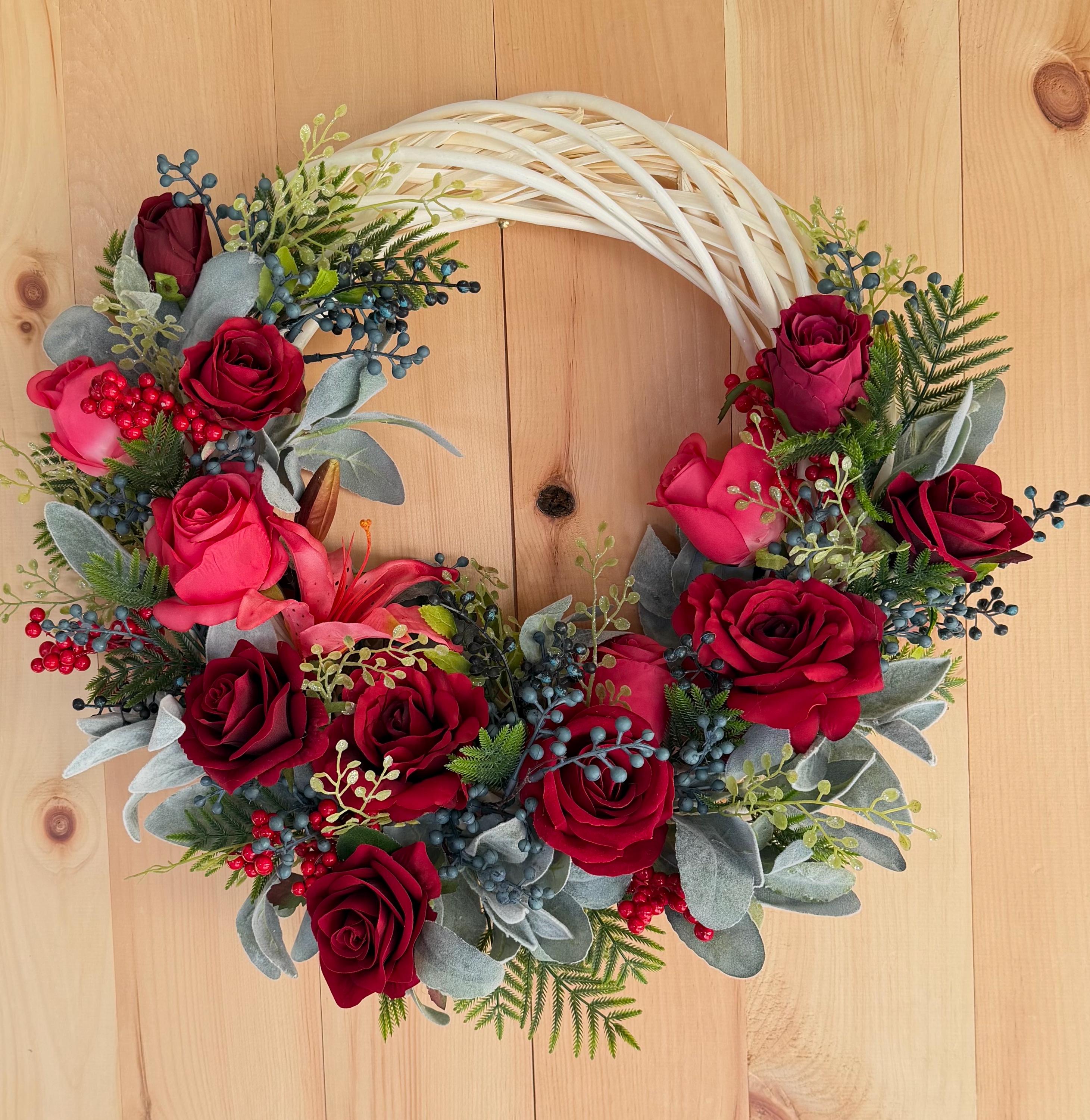 This Eligant wreath decorated with beautiful Red and Pink shaded Roses with Lilies, Berries, Read and green Lambs ear leaves with other greenery will gives a Year around feelings.