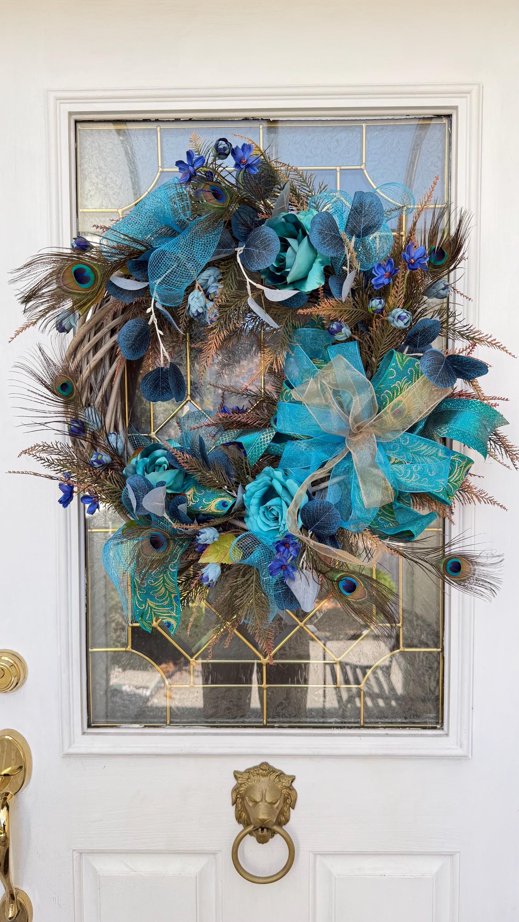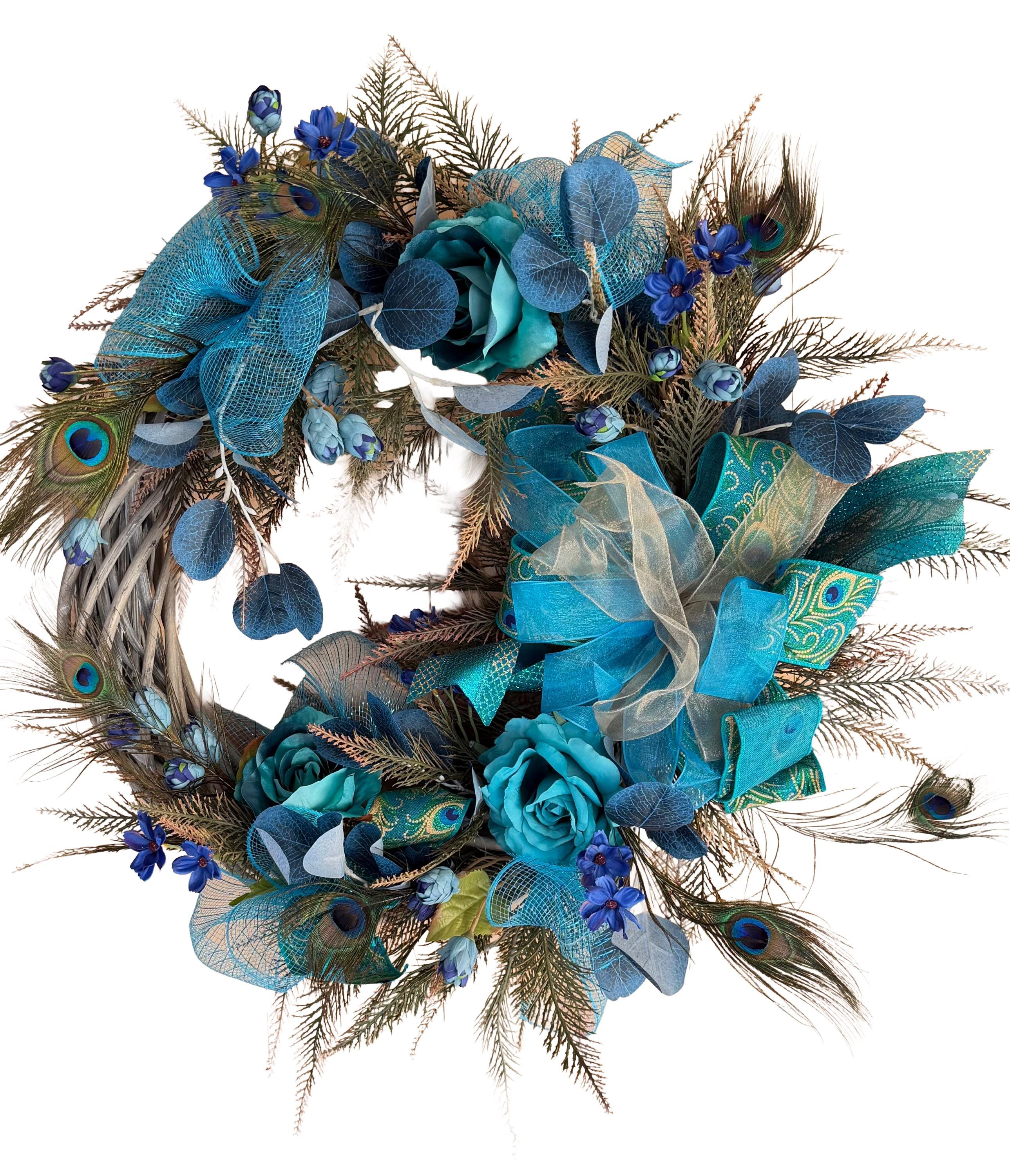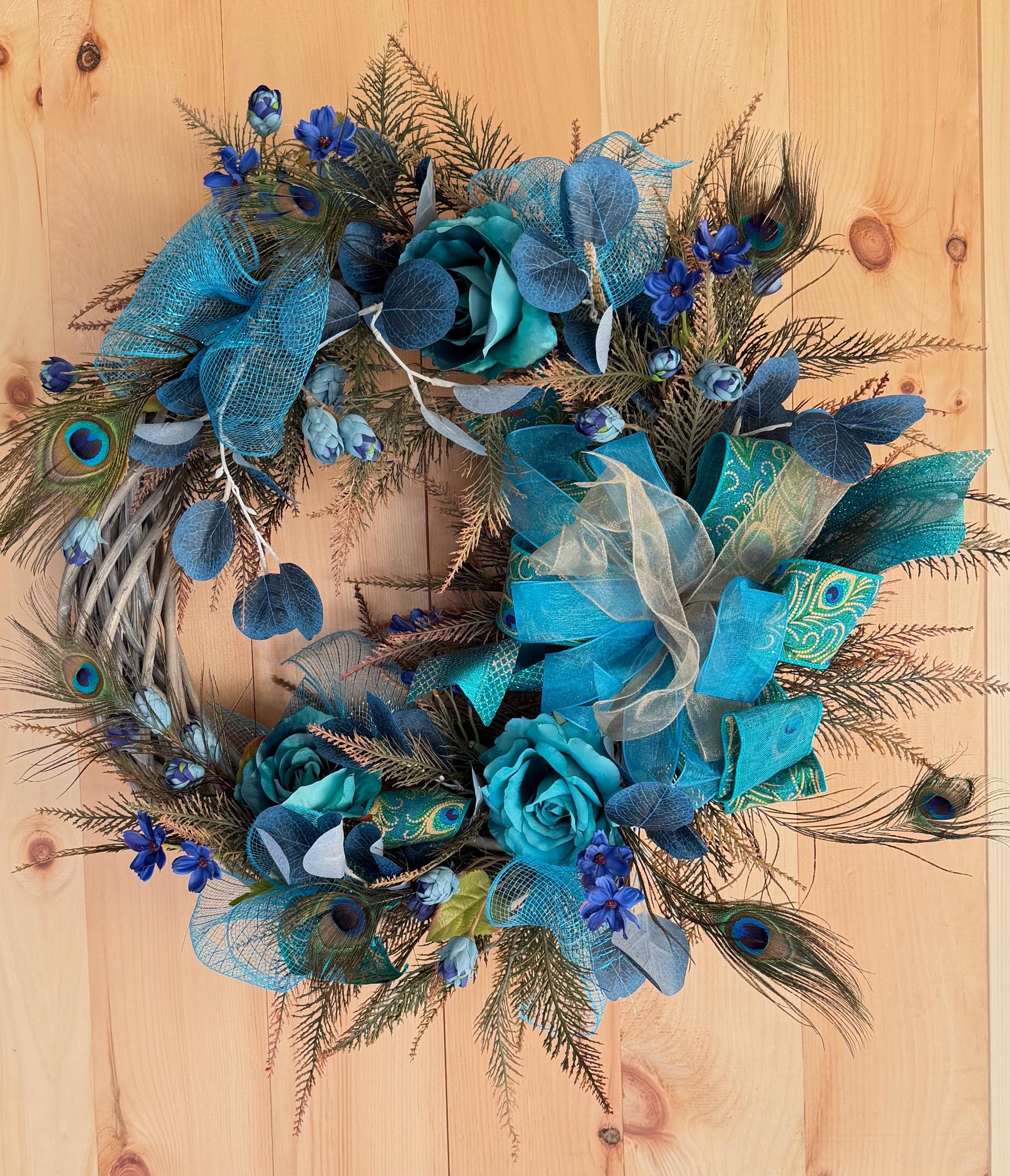 Welcome guests with this charming wreath, handcrafted with love and care. The perfect addition to your front door, this wreath will add a touch of beauty and warmth to your home. Handmade with high-quality materials, this wreath is sure to brighten up any space. Perfect for any season or occasion. This Elegant Peacock wreath is primarily decorated with beautiful Natural Peacock tail Feathers, (Sanitized, using temperature stream- Indicated by the supplier) Peacock Ribbons with Roses, Wild flowers and Ferns. This Wreath is perfect to decorate your home's front door, Hallways, Living room or any room in throughout the year. It's also great as a Gift.