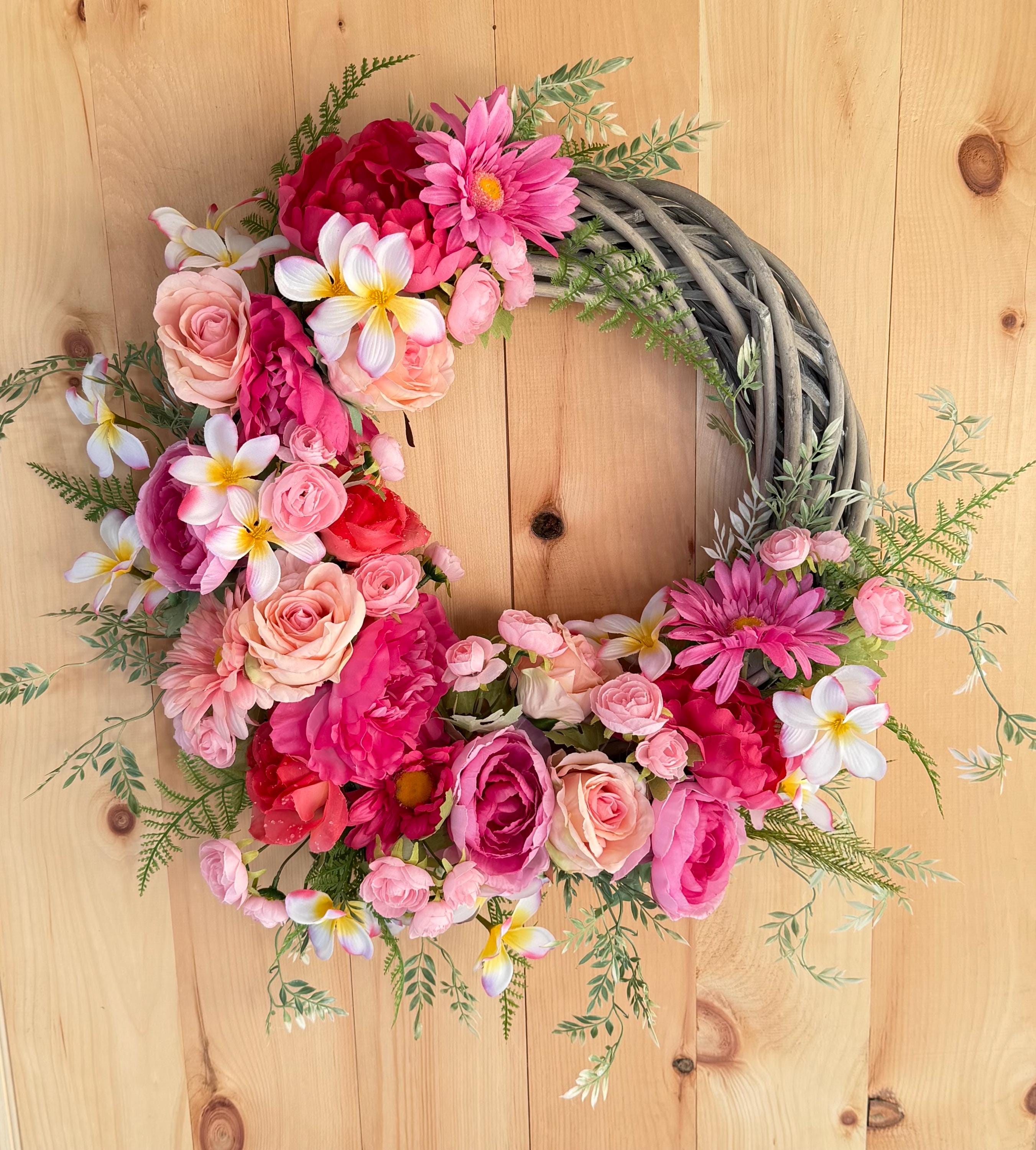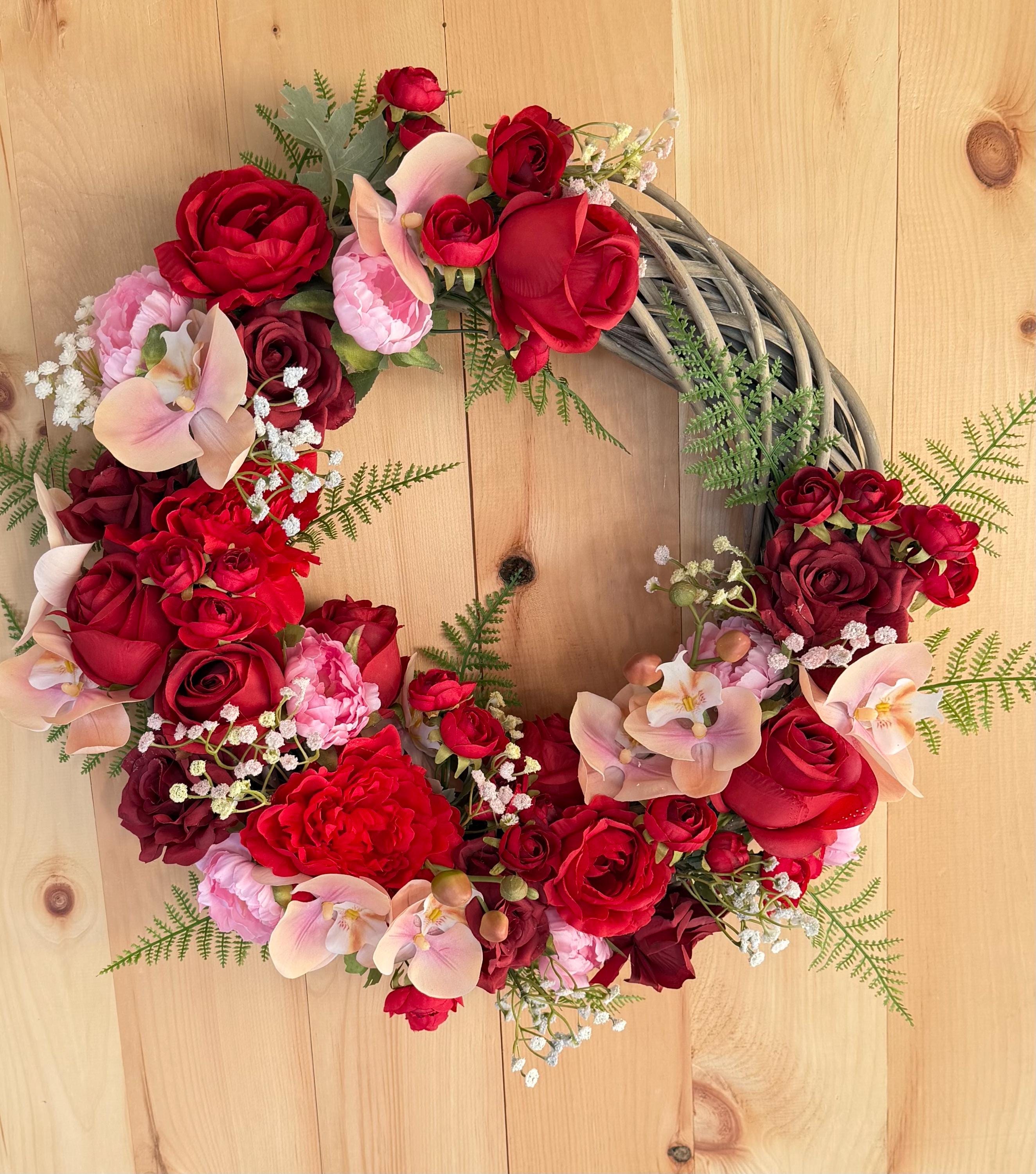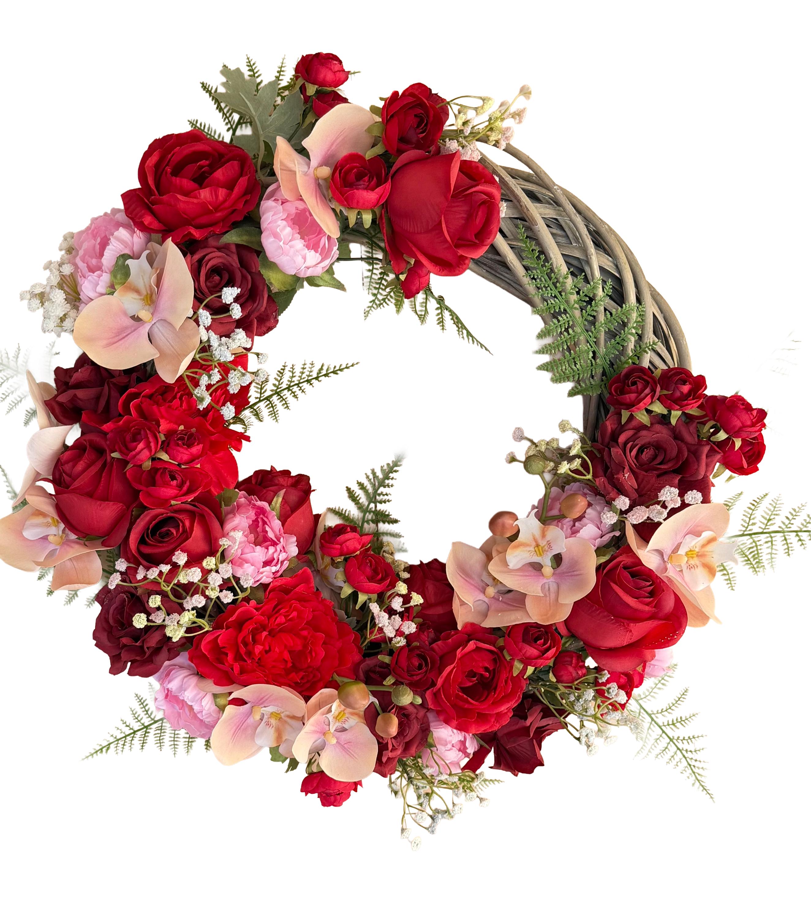 The wreath decorated with beautiful Pink, Red, Dark Red and other shades Peonies, Roses, Orchids, Baby’s breath with wild flowers. Aded Greenery gives you Spring and Summer feeling.