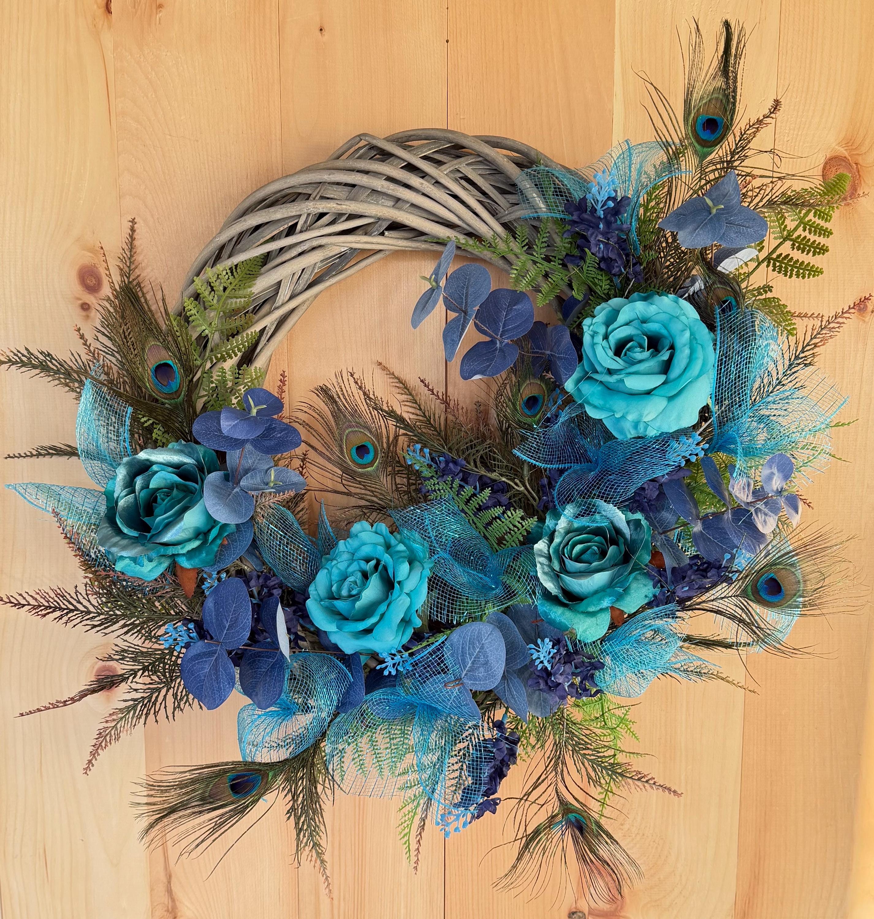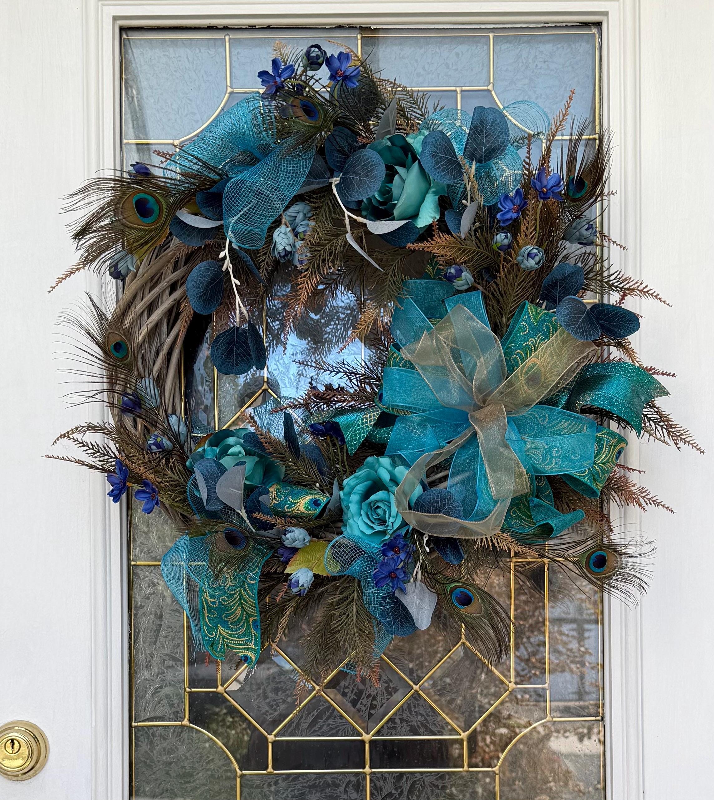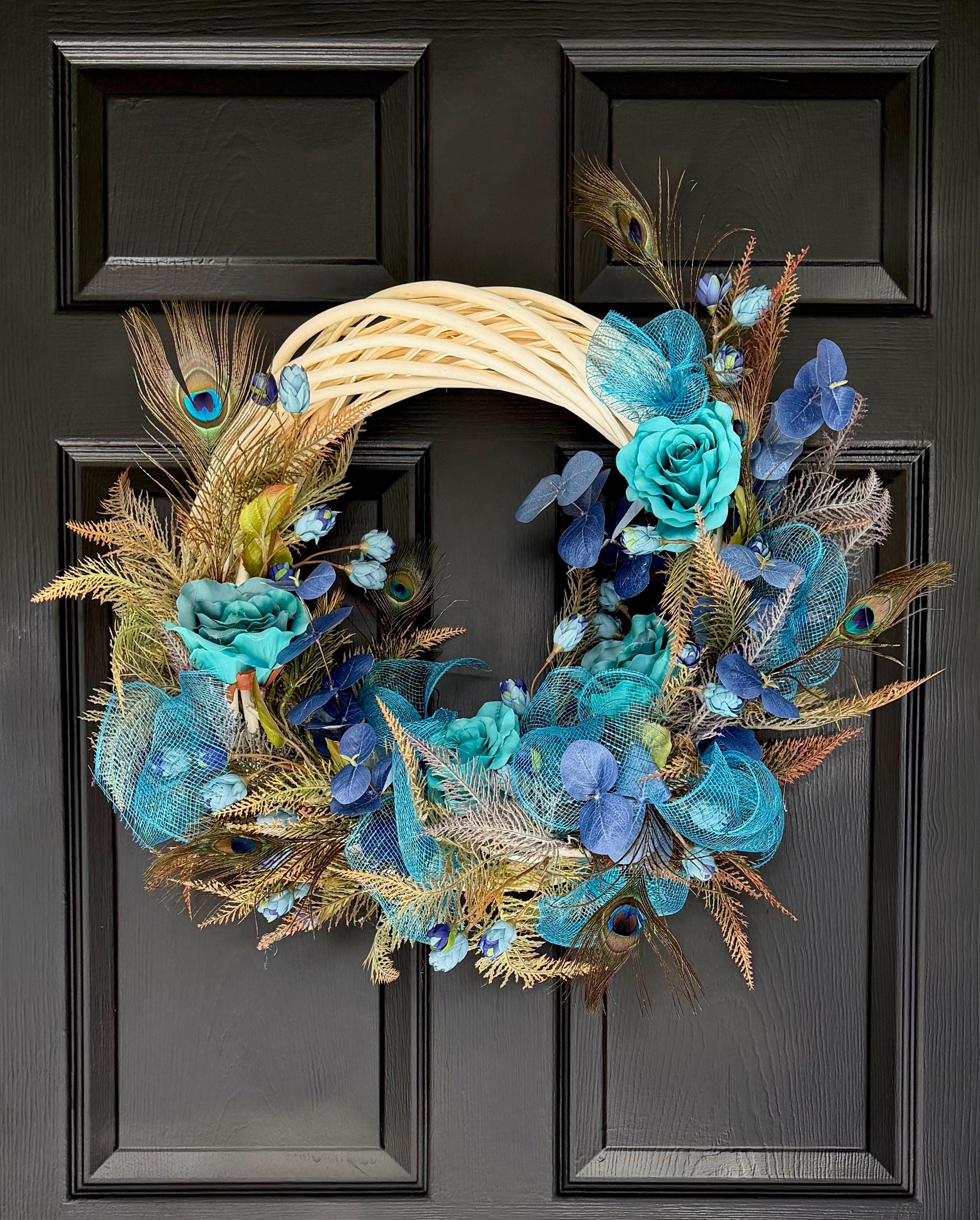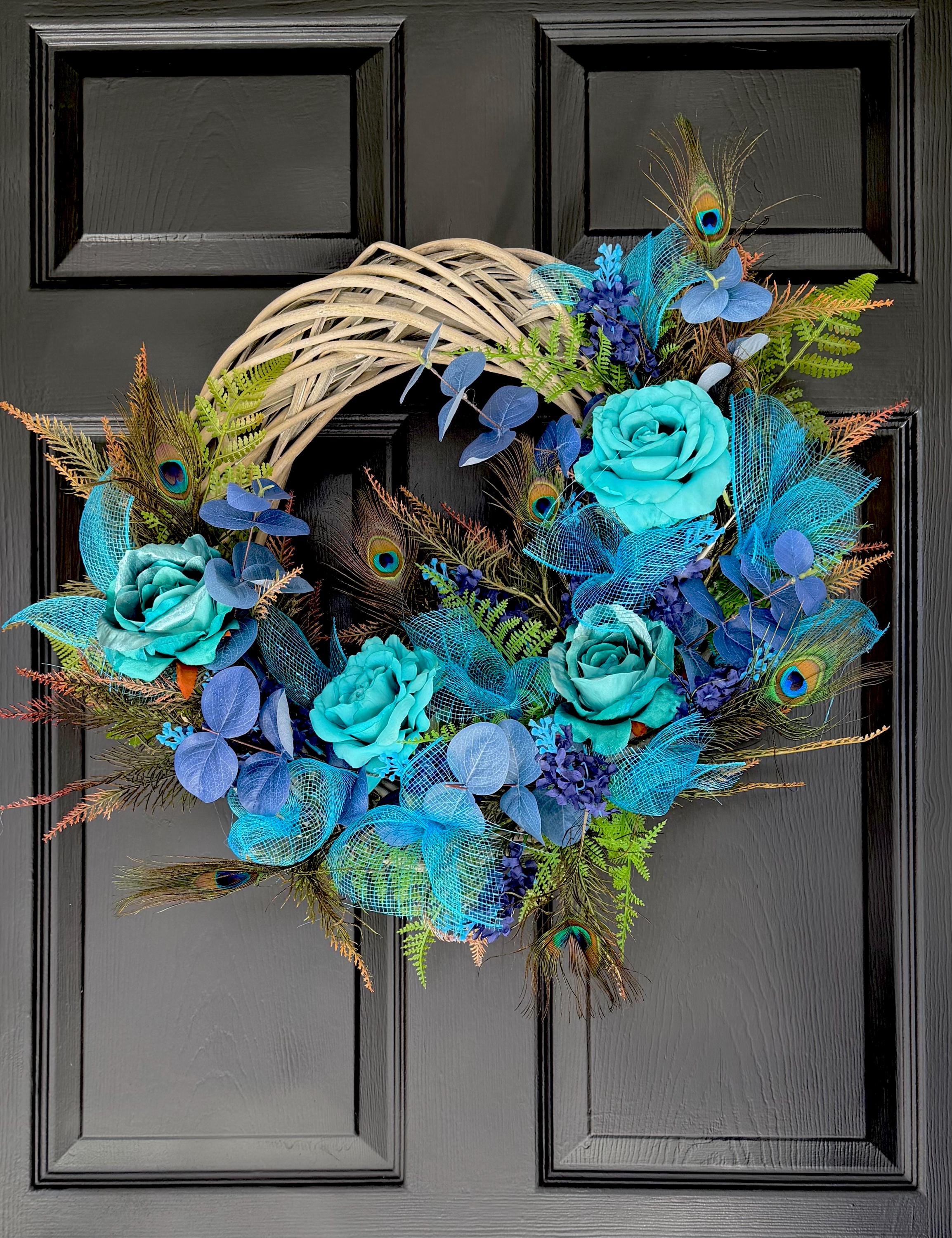 Welcome guests with this Turquoise color charming wreath, handcrafted with love and care. The perfect addition to your front door, this wreath will add a touch of beauty and warmth to your home. Handmade with high-quality materials, this wreath is sure to brighten up any space. Perfect for any season or occasion. This Elegant Peacock wreath is primarily decorated with beautiful Natural Peacock tail Feathers, (Sanitized, using temperature stream- Indicated by the supplier) Peacock Ribbons and Roses and Ferns. This Wreath is perfect to decorate your home's front door, Hallways, Living room or any room in throughout the year. It's also great as a Gift.