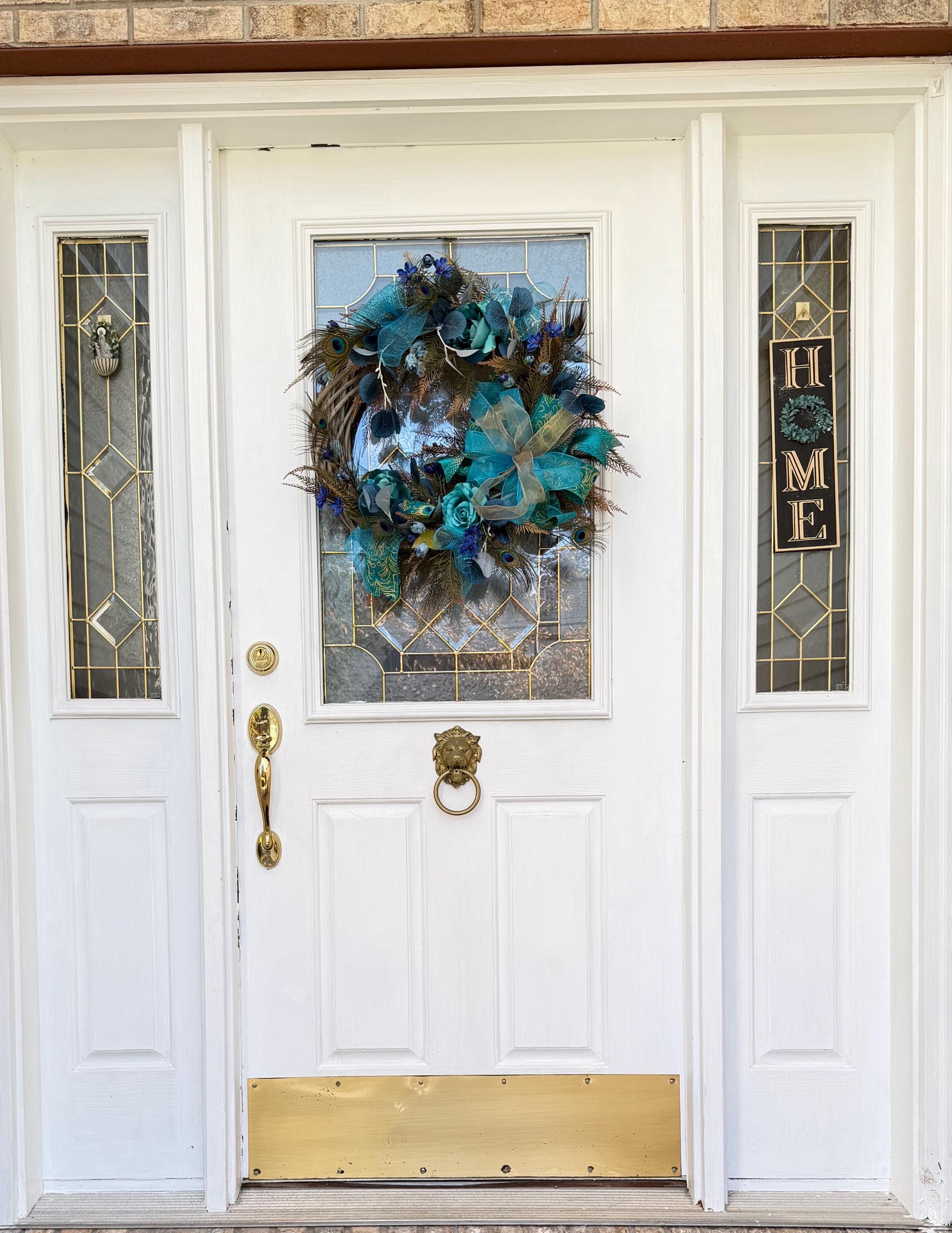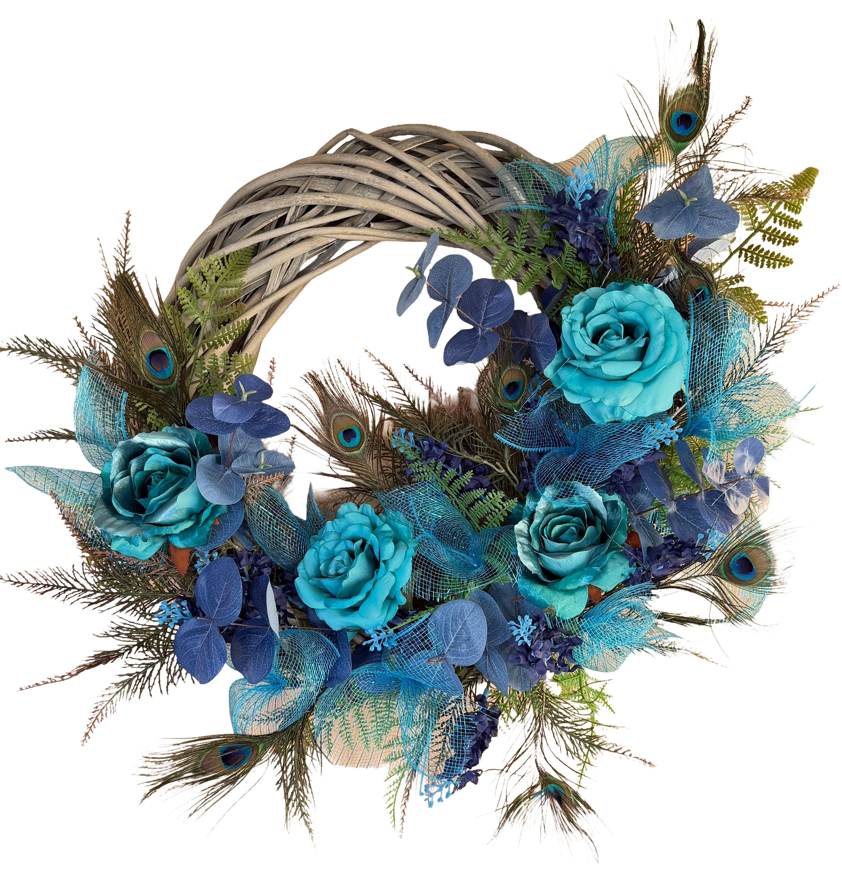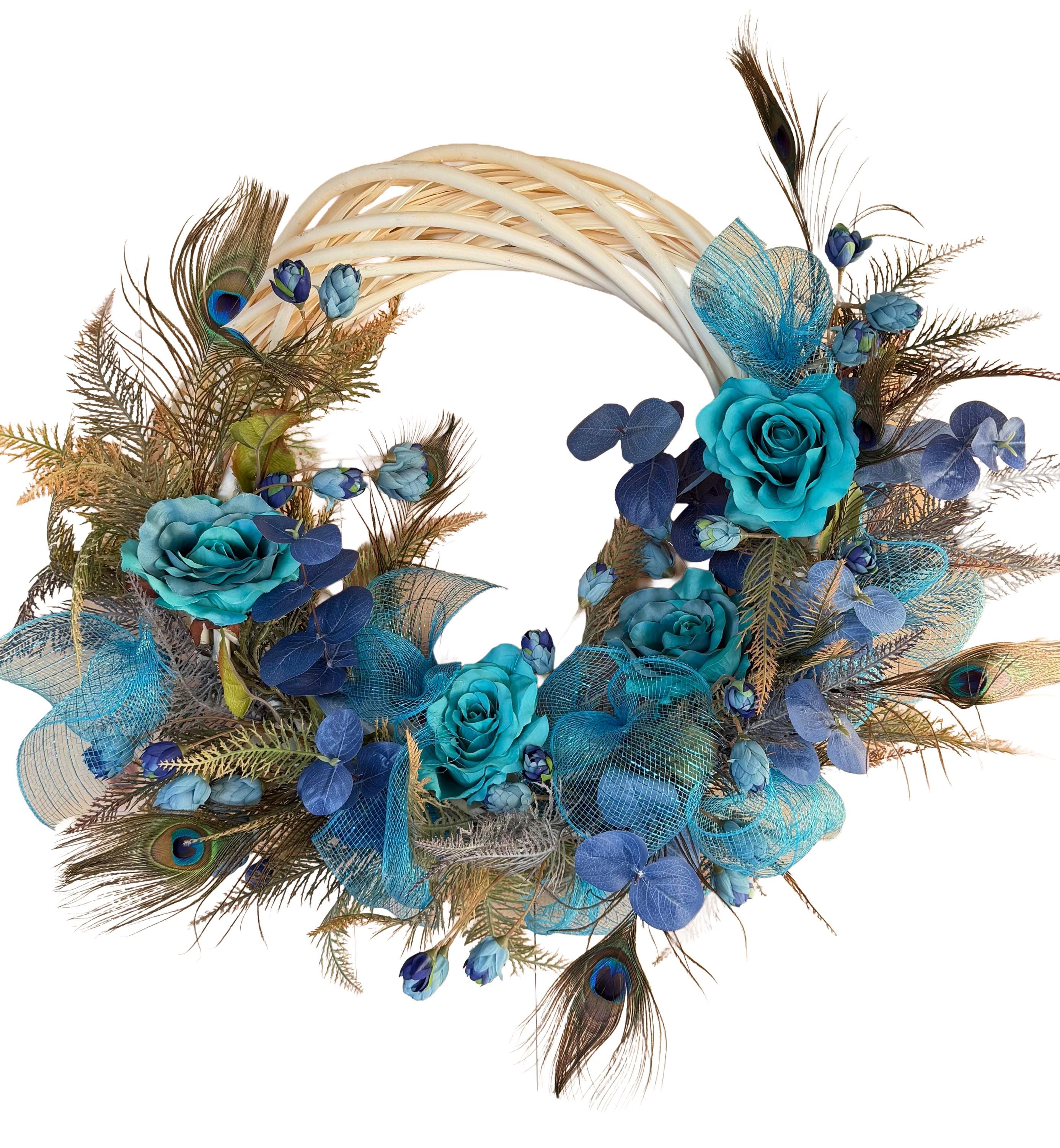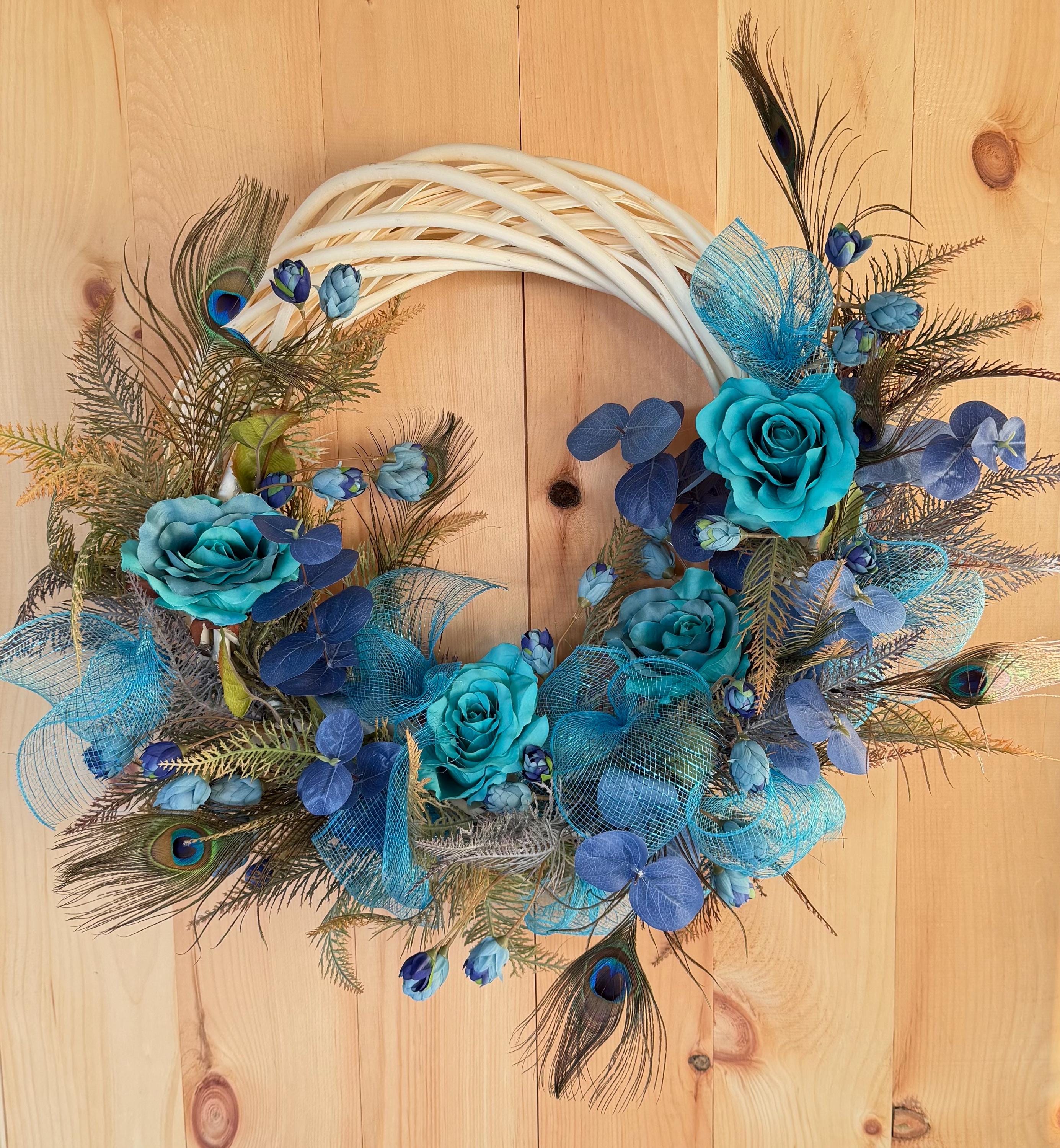 Welcome guests with this Turquoise color charming wreath, handcrafted with love and care. The perfect addition to your front door, this wreath will add a touch of beauty and warmth to your home. Handmade with high-quality materials, this wreath is sure to brighten up any space. Perfect for any season or occasion. This Elegant Peacock wreath is primarily decorated with beautiful Natural Peacock tail Feathers, (Sanitized, using temperature stream- Indicated by the supplier) Peacock Ribbons and Roses and Ferns. This Wreath is perfect to decorate your home's front door, Hallways, Living room or any room in throughout the year. It's also great as a Gift.