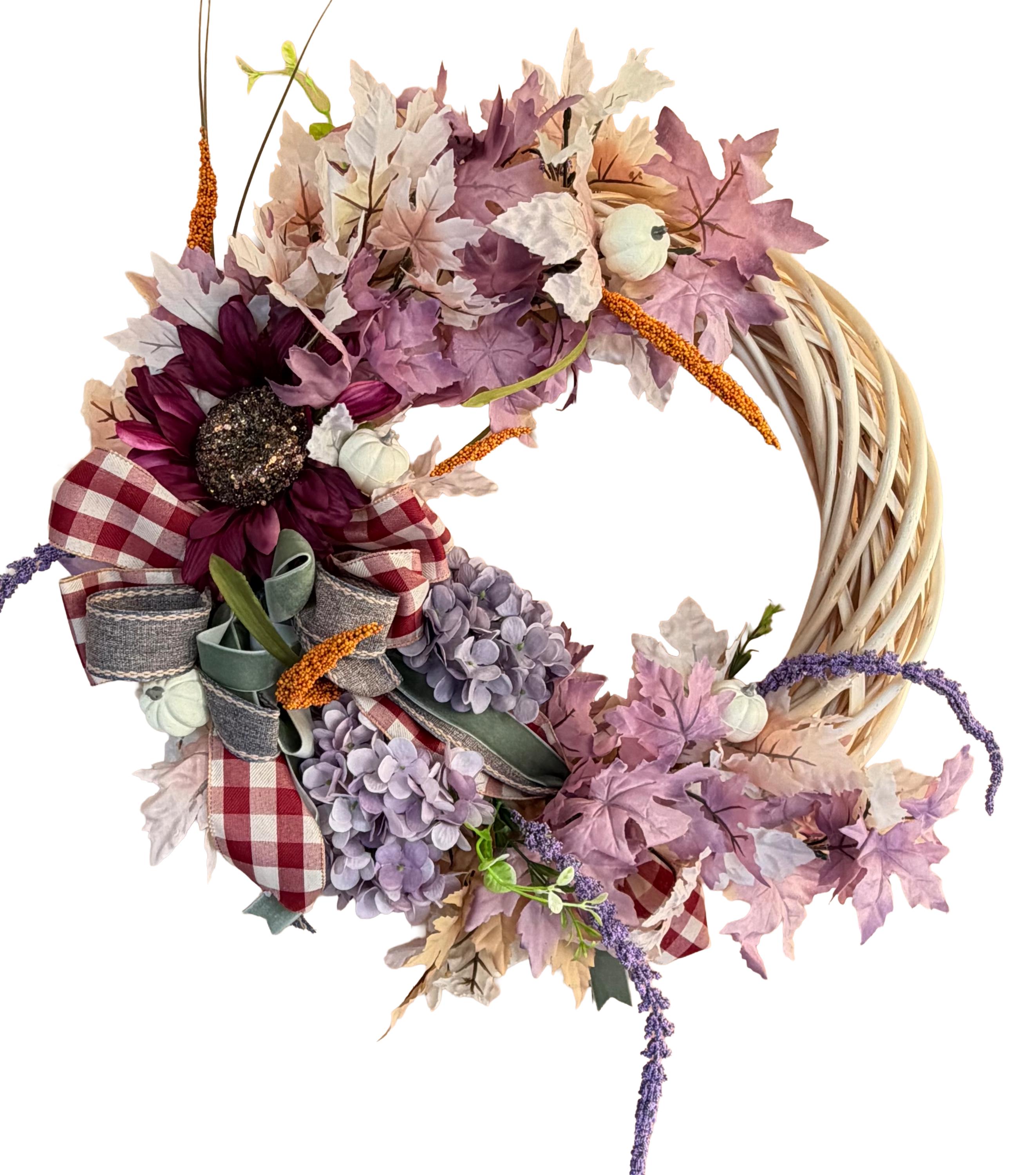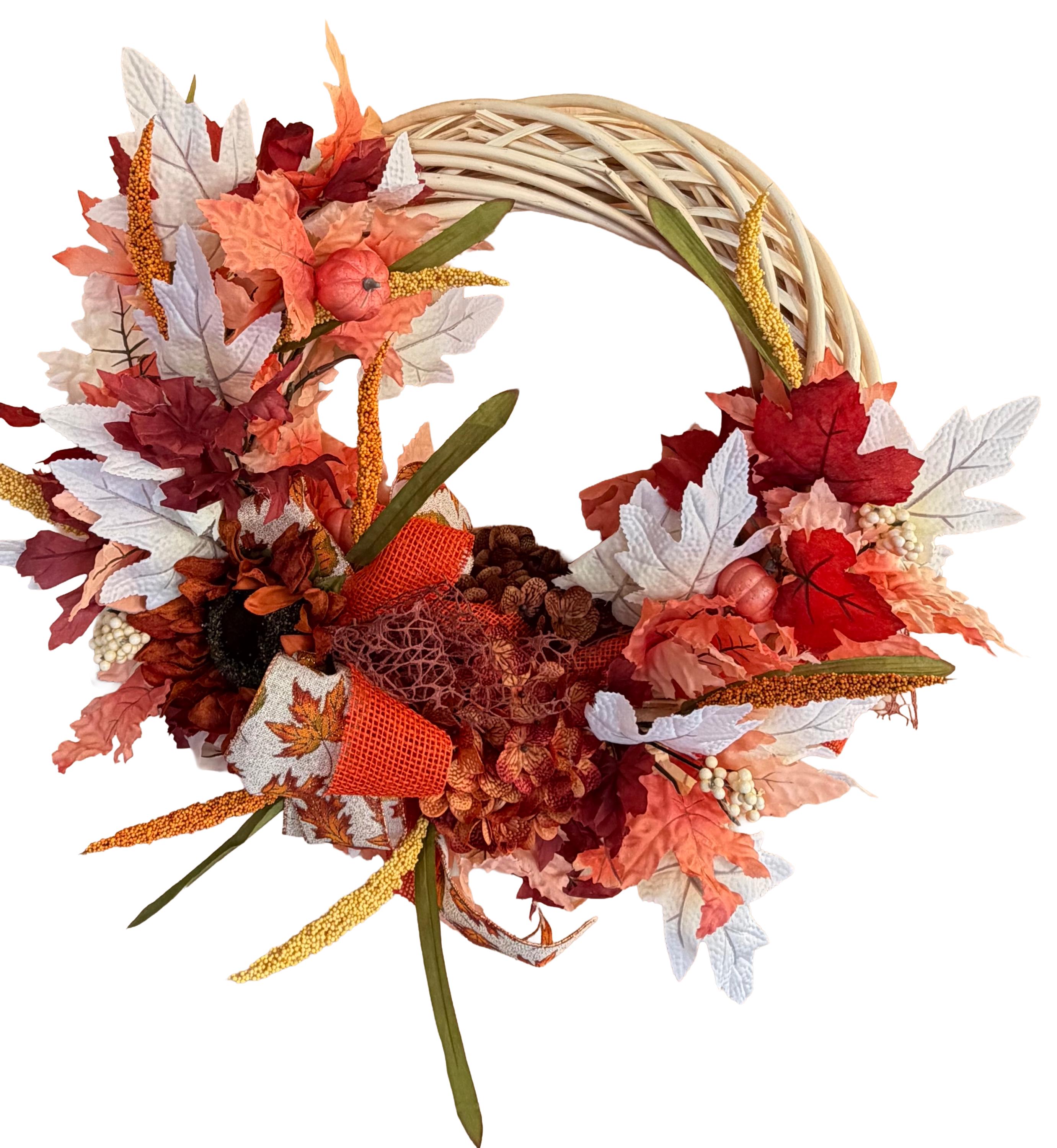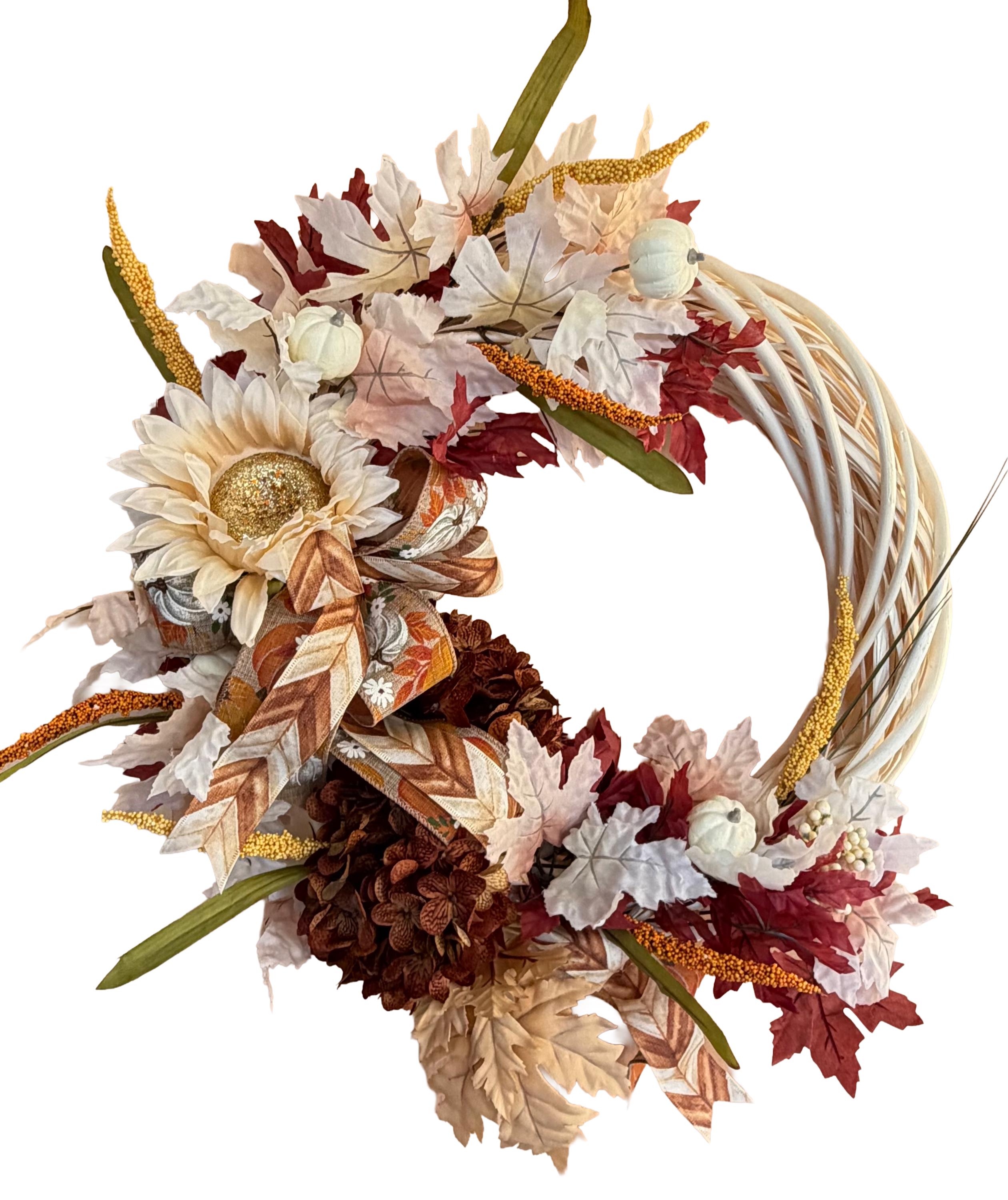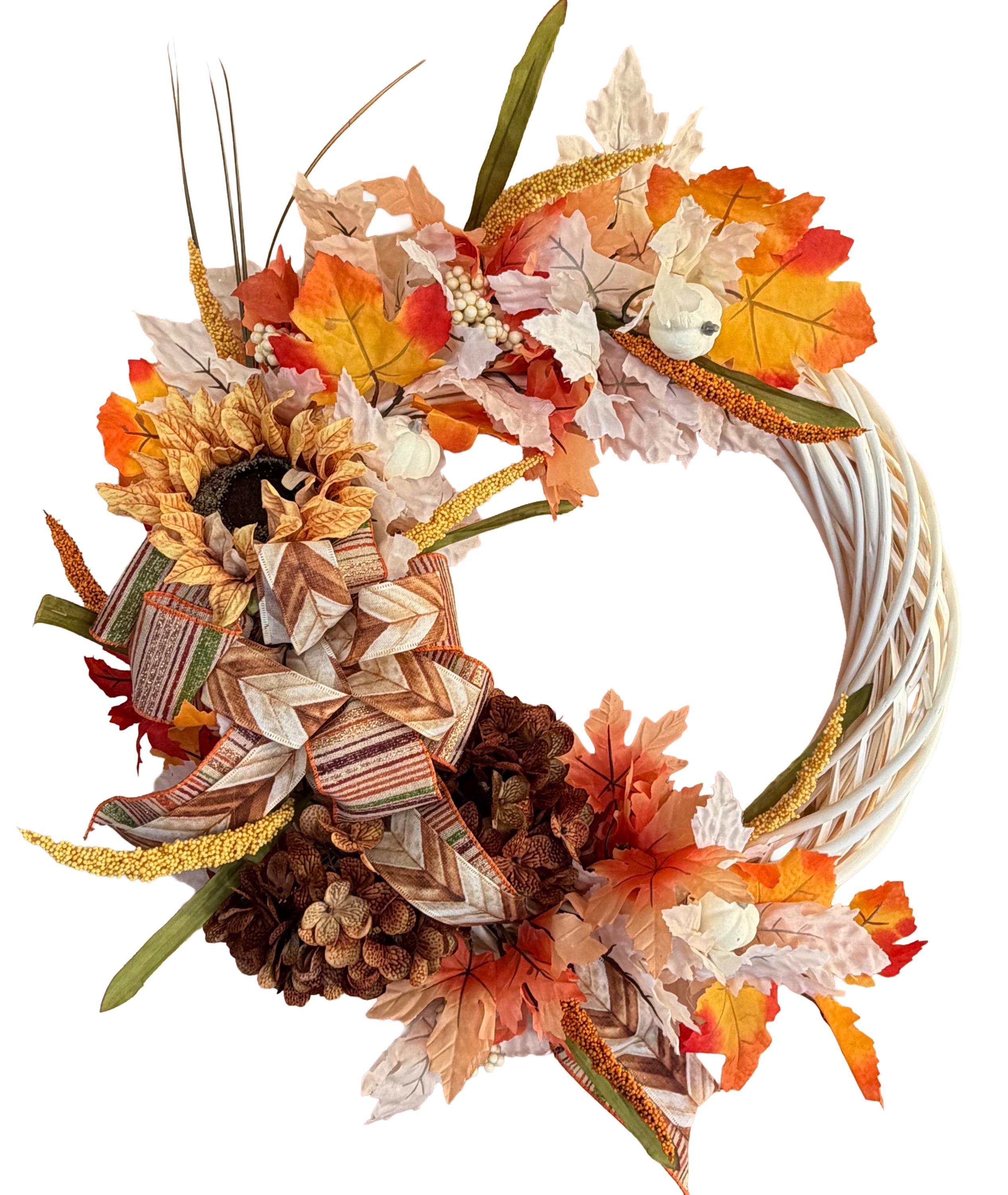 Welcome autumn in style with this beautifully handcrafted 18" Fall Wreath, designed to bring warmth and charm to your front door or indoor space. Built on a natural rattan wreath base, this seasonal favorite features a lush mix of maple leaves, hydrangea blooms, sunflowers, and wildflowers, accented with a mini pumpkin and a rustic ribbon bow.