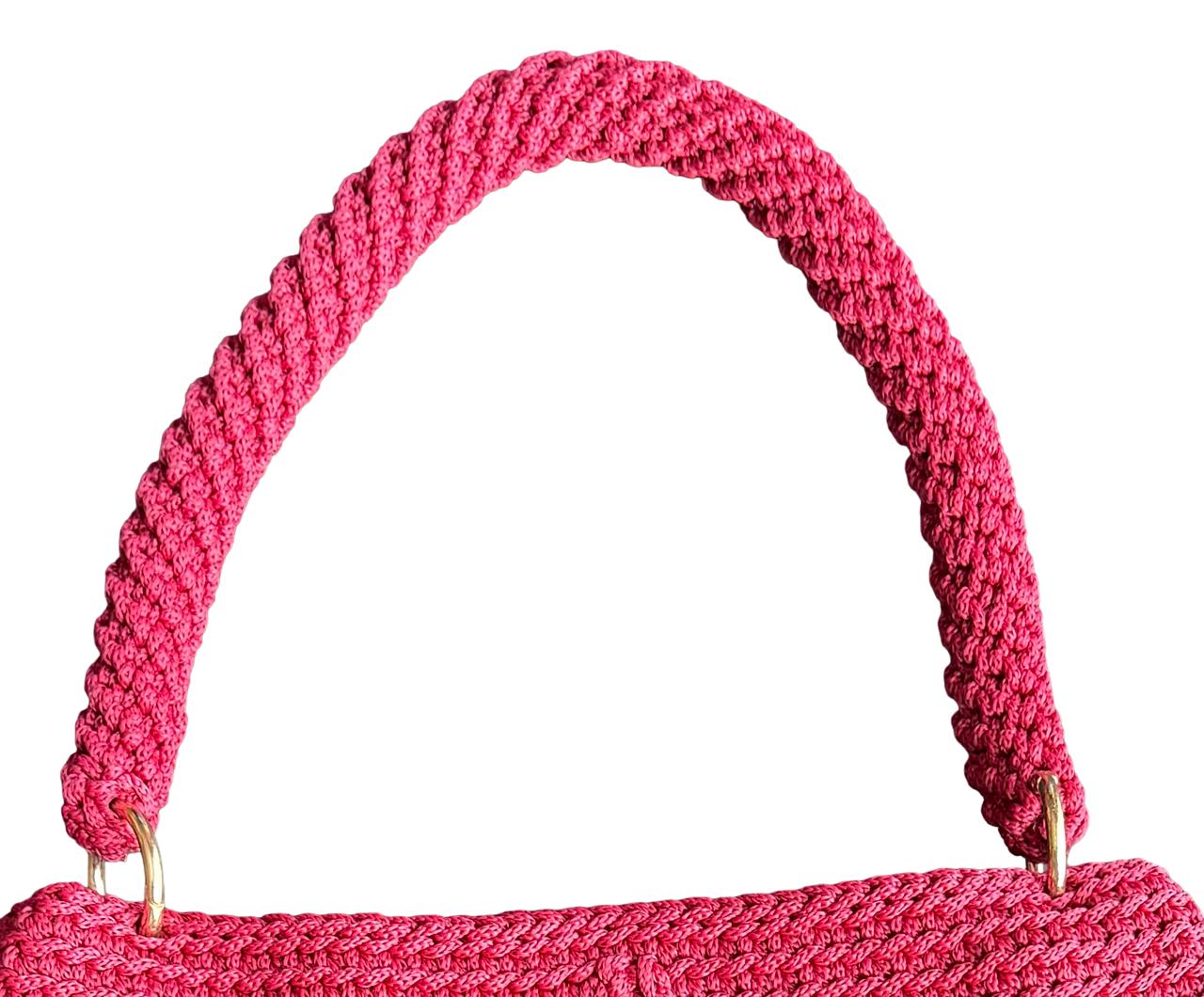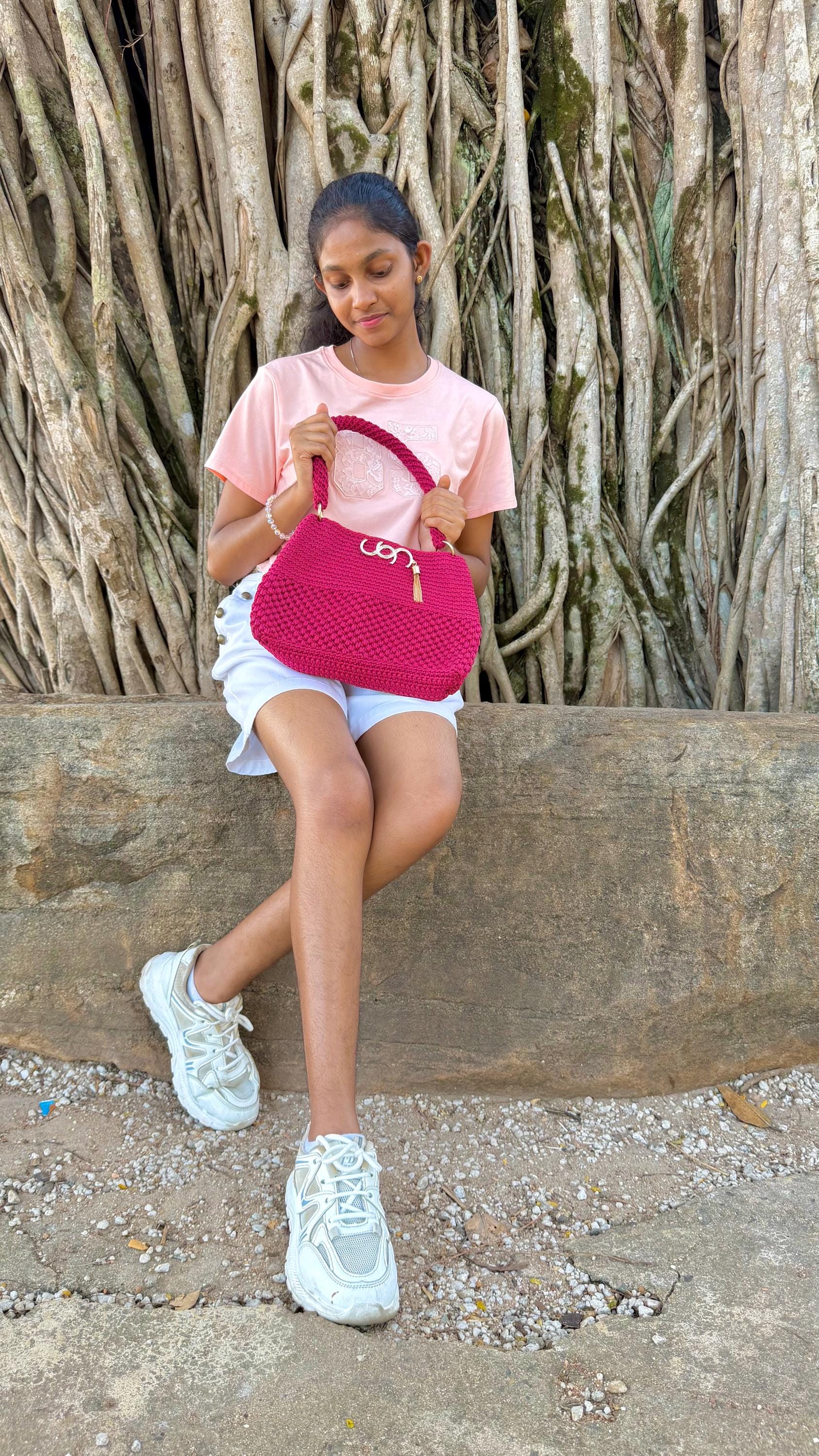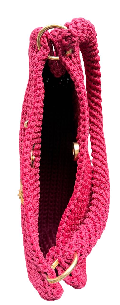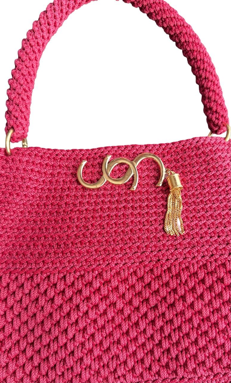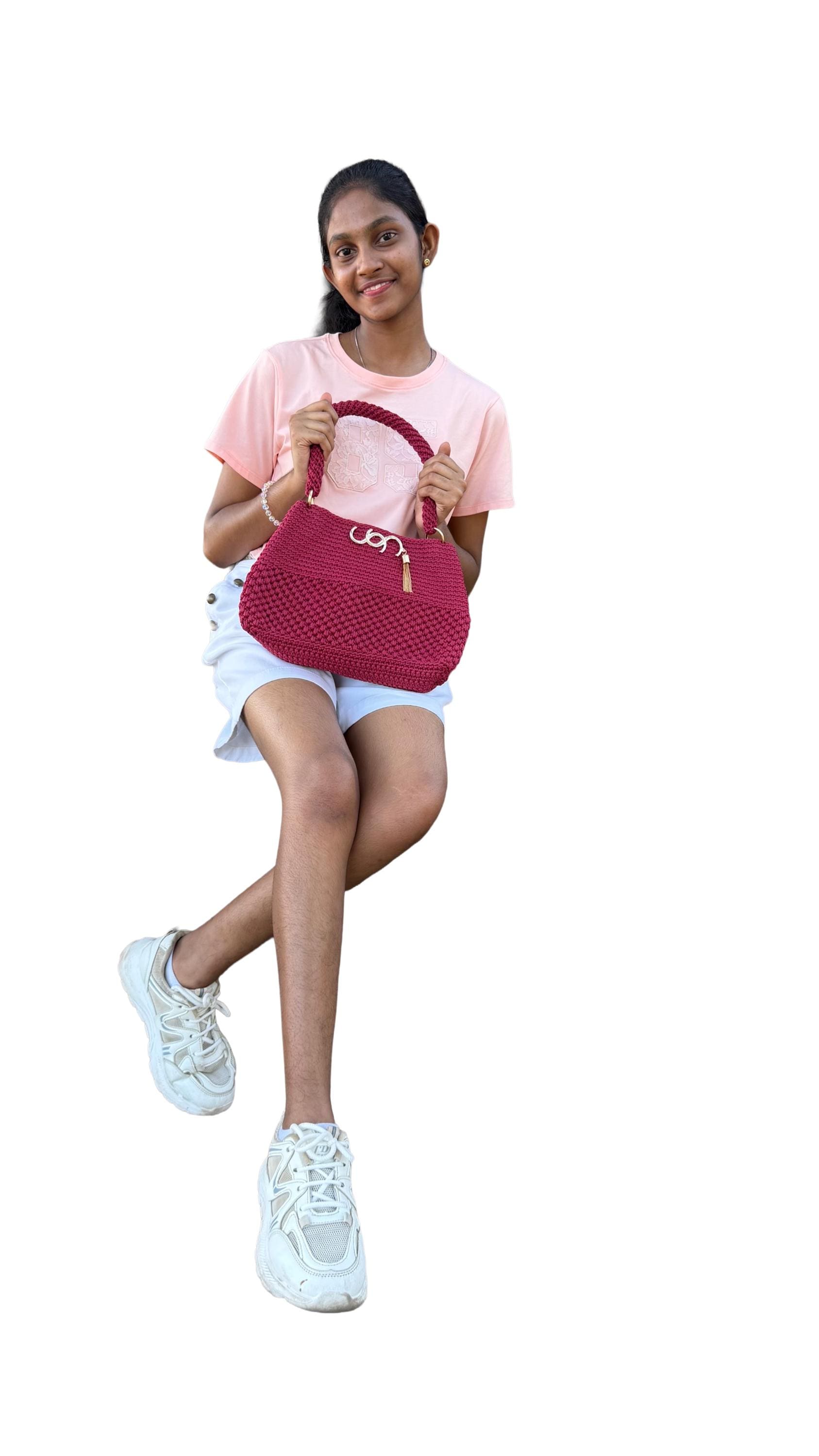 Handmade Crochet Clutch Handbag for Women, Deep Maroon Berry Pink, Handwoven Shoulder Bag with Gold-Tone Rings and Tassel Charm. Elevate your accessories collection with this exquisite handmade crochet clutch in a stunning deep maroon berry pink. Meticulously crafted by skilled artisans, this handbag showcases intricate textural patterns and dimensional stitch work that creates a unique, eye-catching design.