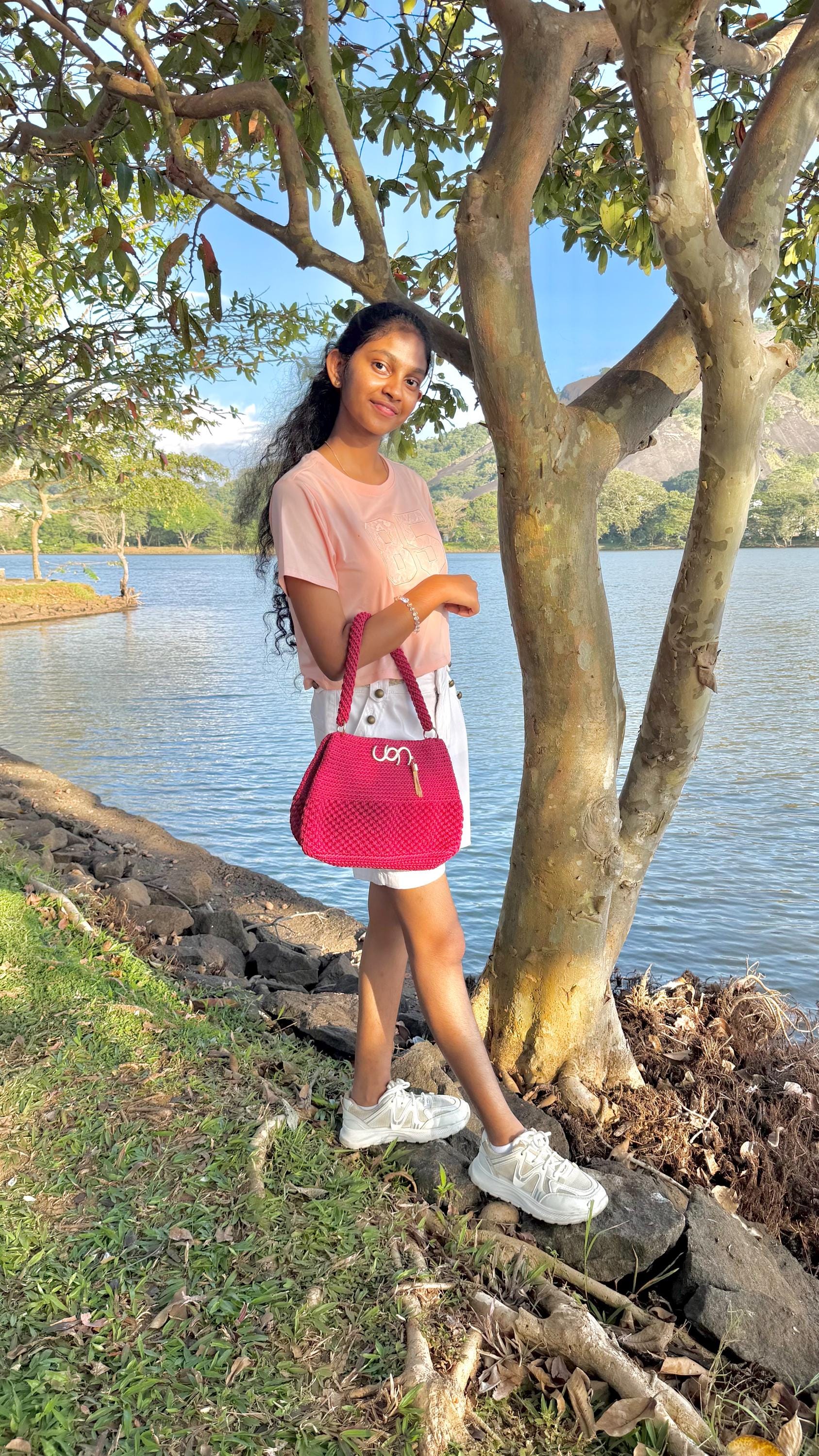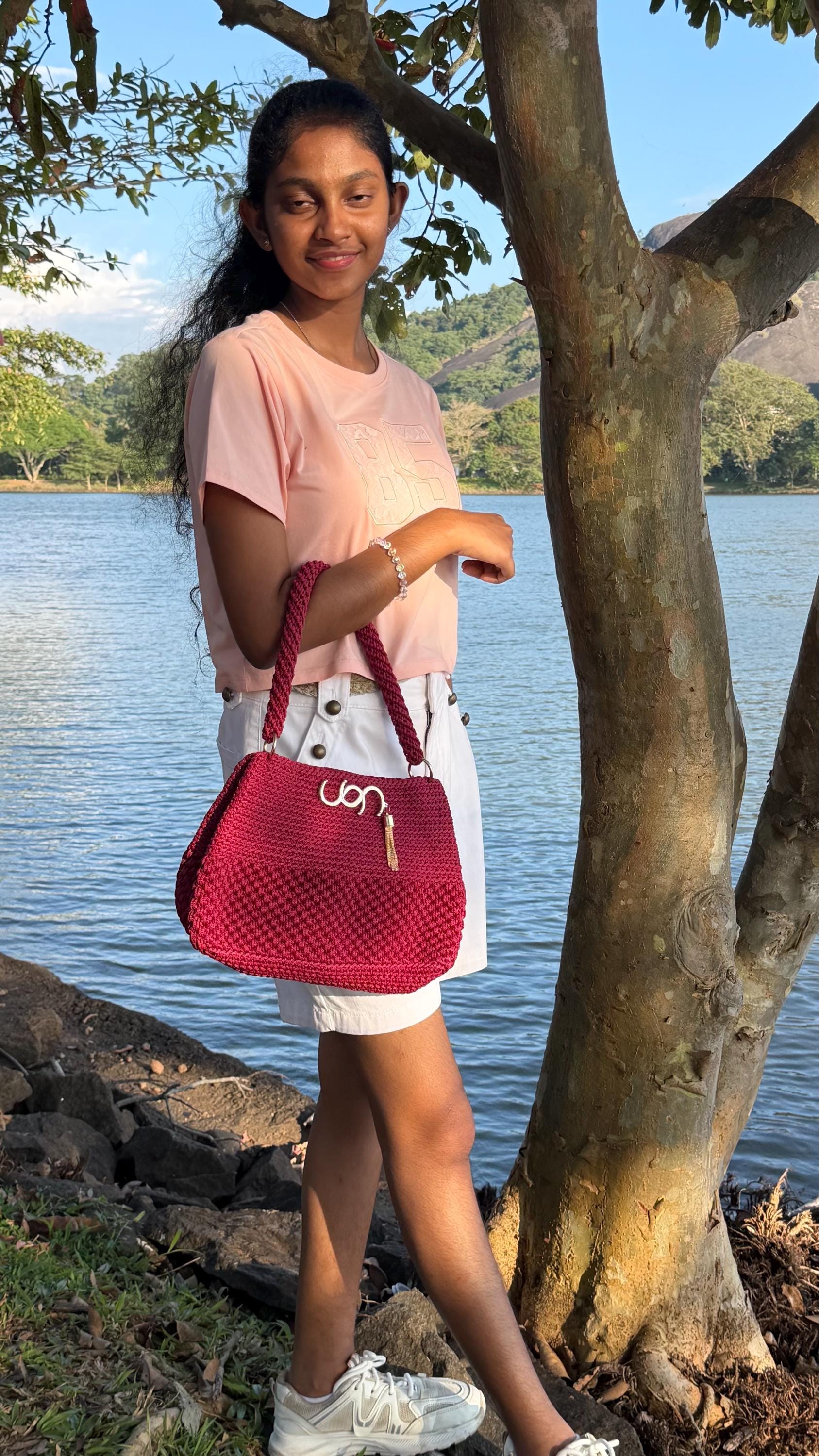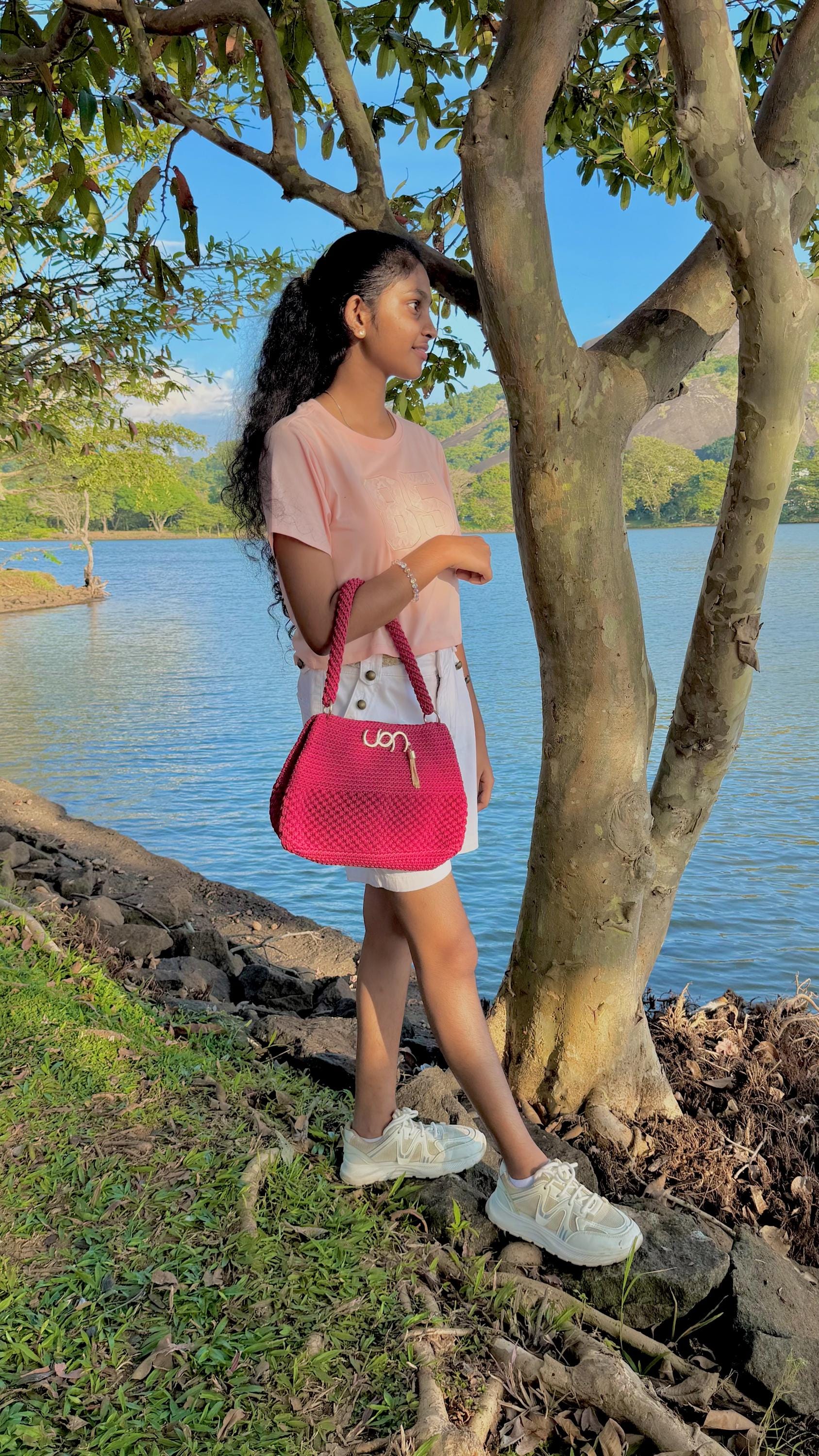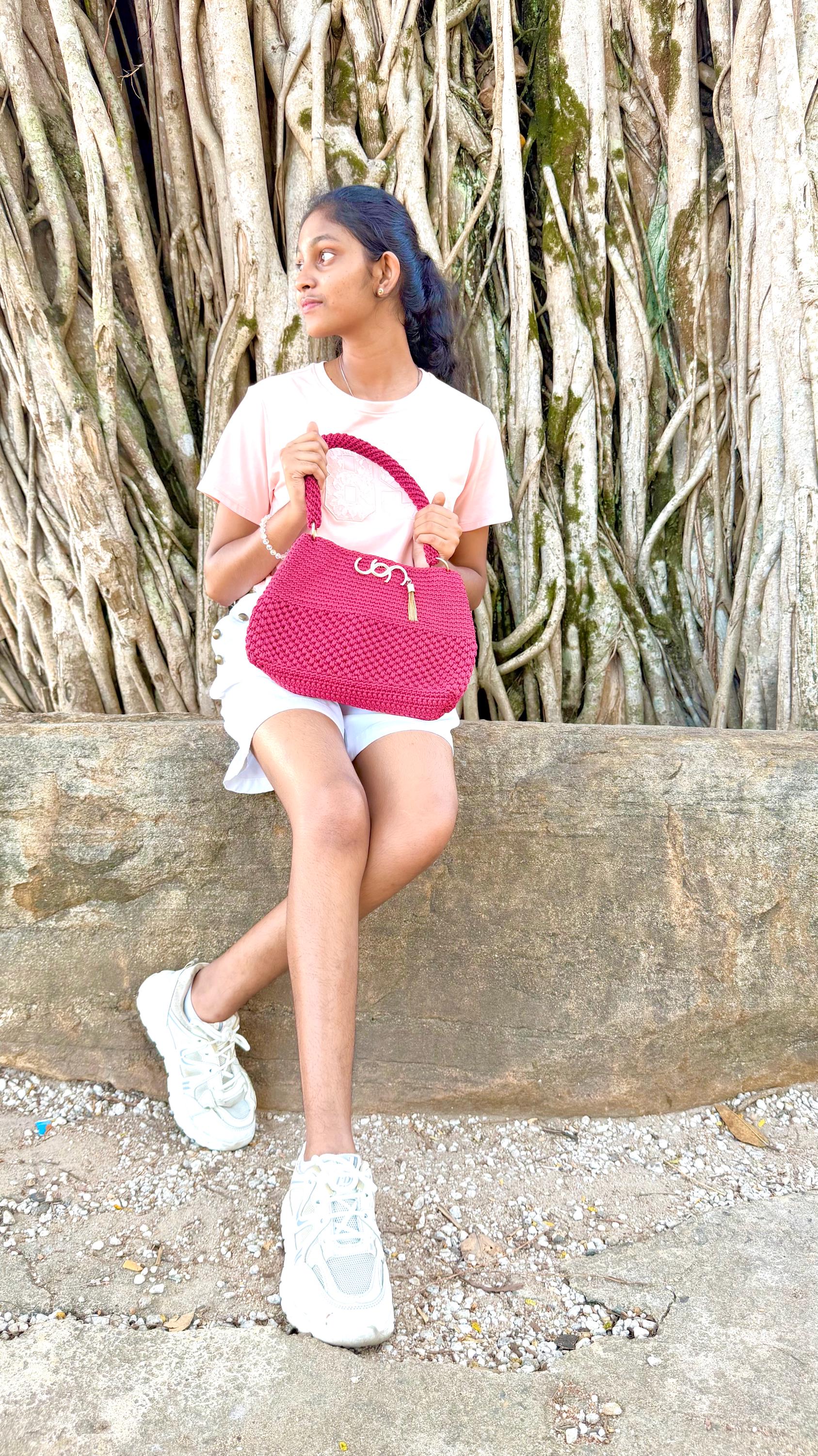 Handmade Crochet Clutch Handbag for Women, Deep Maroon Berry Pink, Handwoven Shoulder Bag with Gold-Tone Rings and Tassel Charm. Elevate your accessories collection with this exquisite handmade crochet clutch in a stunning deep maroon berry pink. Meticulously crafted by skilled artisans, this handbag showcases intricate textural patterns and dimensional stitch work that creates a unique, eye-catching design.