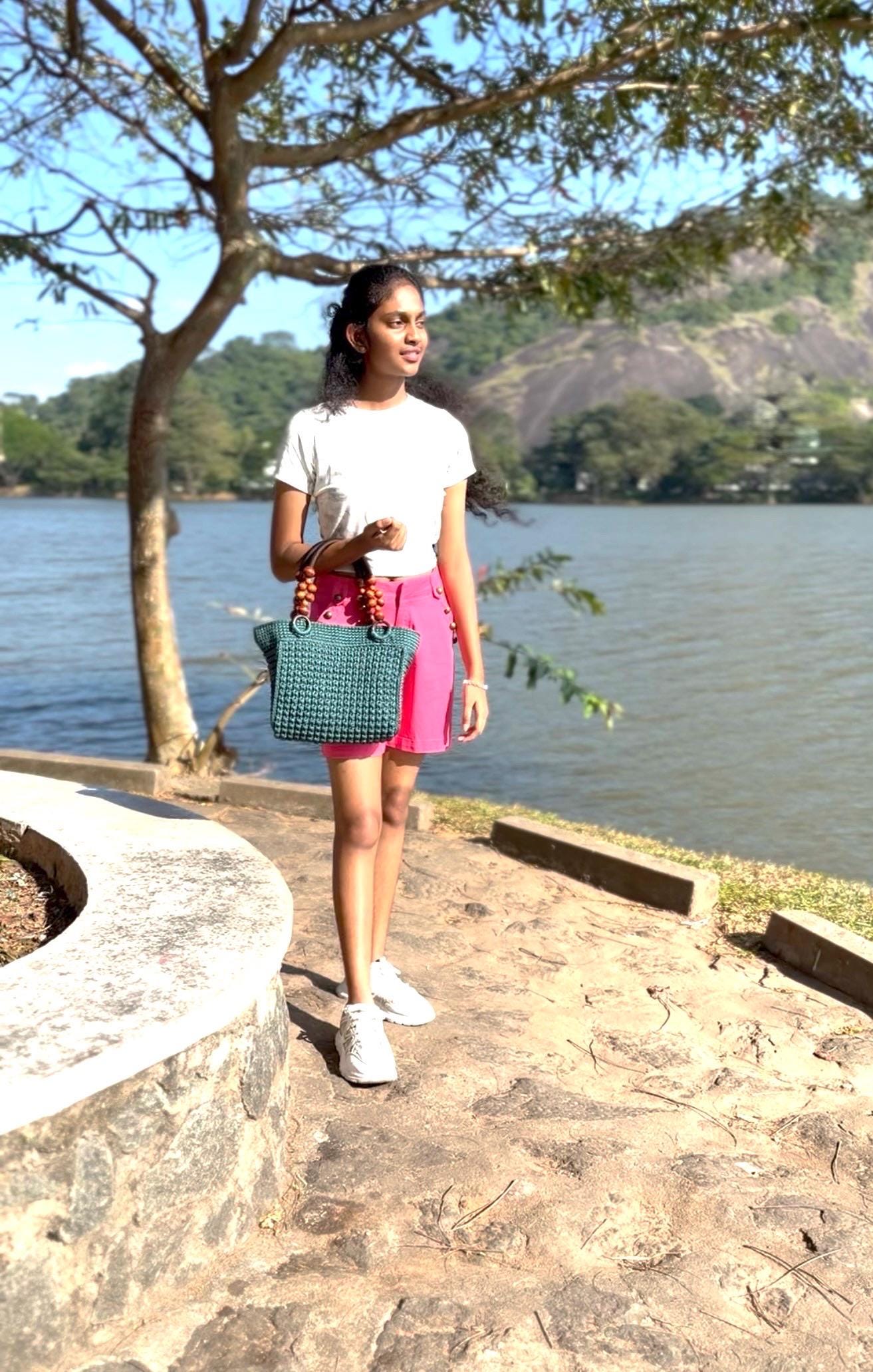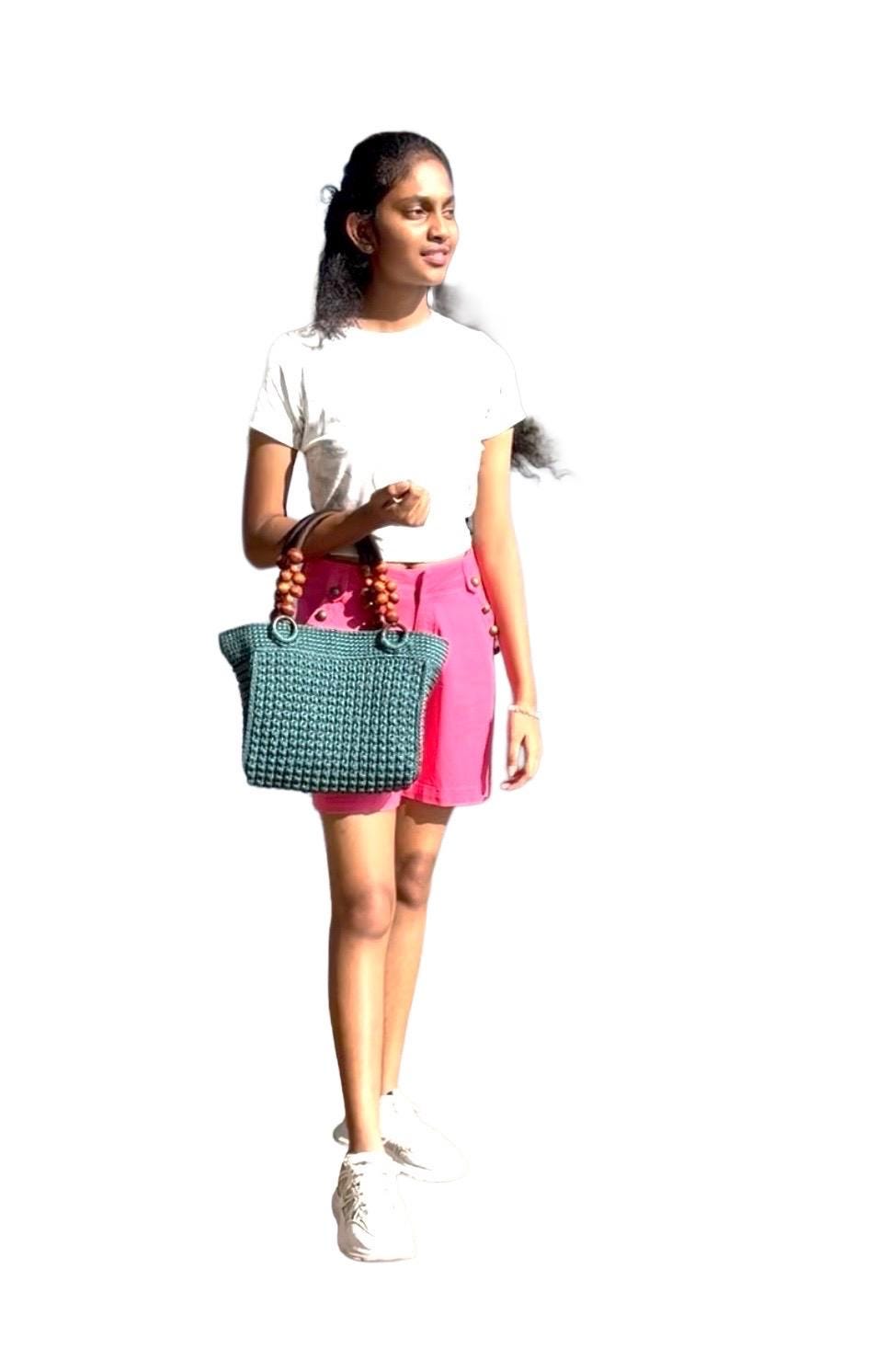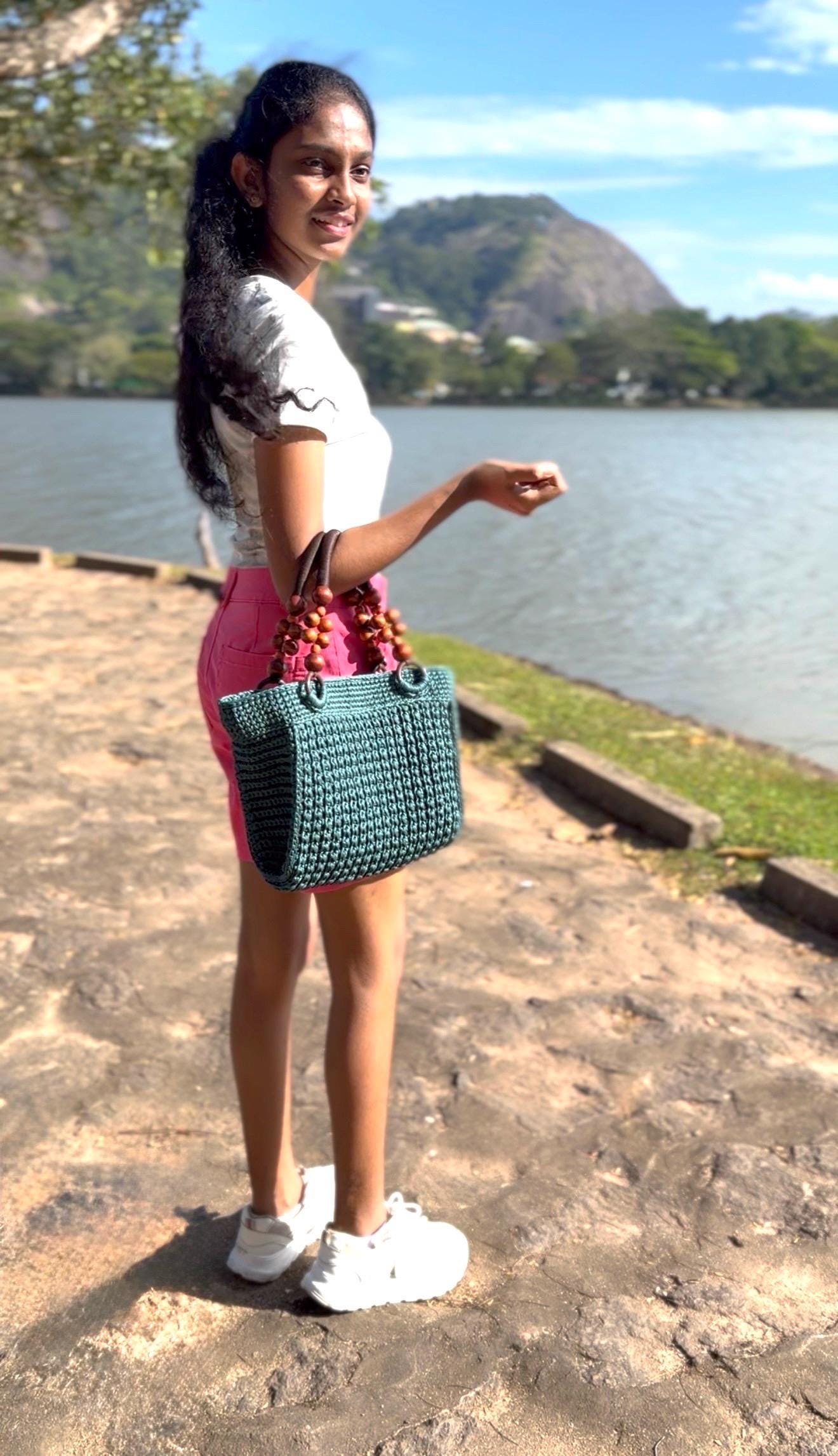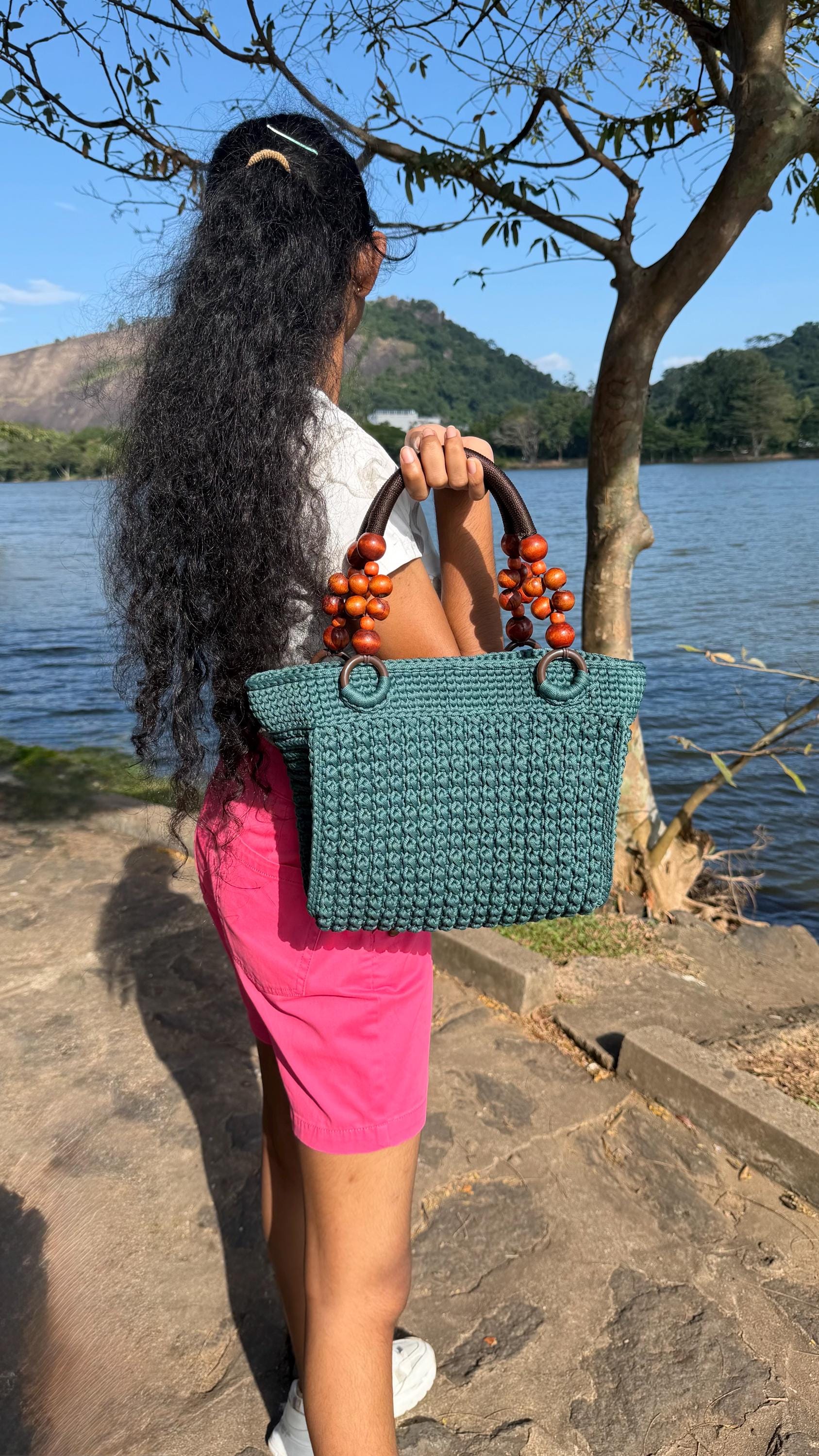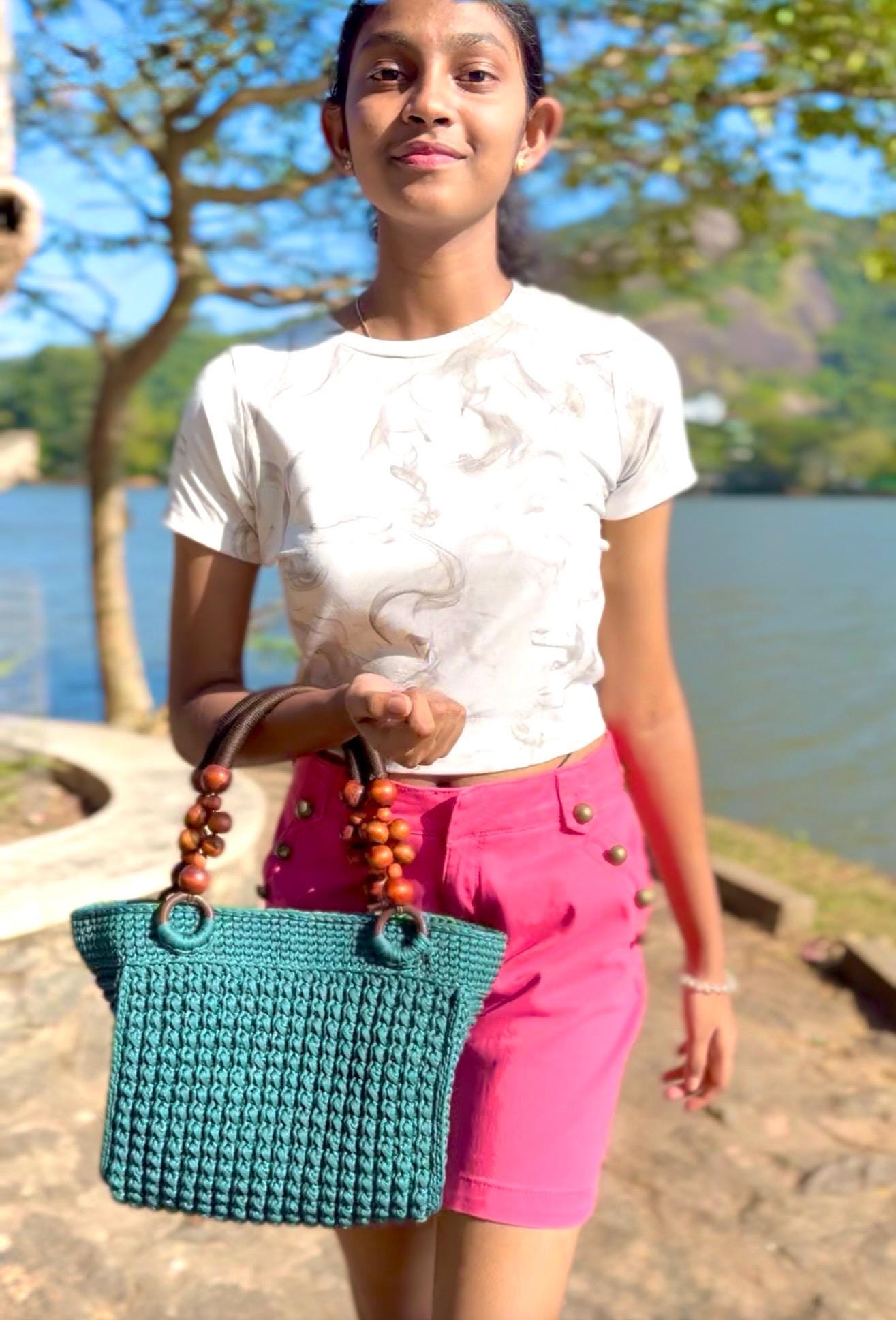 Elevate your everyday style with this exquisite handmade crochet handbag in a refreshing turquoise hue. Meticulously crafted with premium yarn, this hobo-style bag showcases a stunning textured pattern that adds depth and visual interest. The thoughtfully designed wooden bead handles not only provide a comfortable grip but also bring a natural, bohemian touch to the overall aesthetic. Despite its lightweight construction, this bag offers remarkable durability for daily use. The spacious interior provides ample room for your essentials, making it perfect for everything from casual outings to weekend adventures. Each stitch reflects superior craftsmanship, creating a unique accessory that stands out from mass-produced alternatives. The versatile design complements both casual and semi-formal attire, while the timeless turquoise color adds a fresh pop to any outfit. This artisan-made handbag makes a thoughtful gift or a special treat for yourself, combining style, functionality, and artisanal charm in one beautiful package.